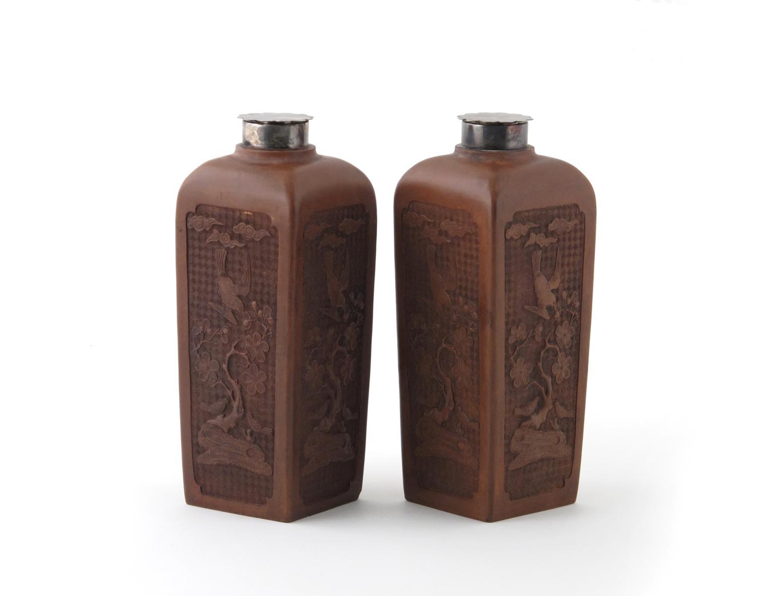 A pair of Yixing square-section flasks or vases each side applied with three birds in flight above or perched below prunus branches on a diaper ground, the necks metal-mounted and with metal covers, 24cm. (4)