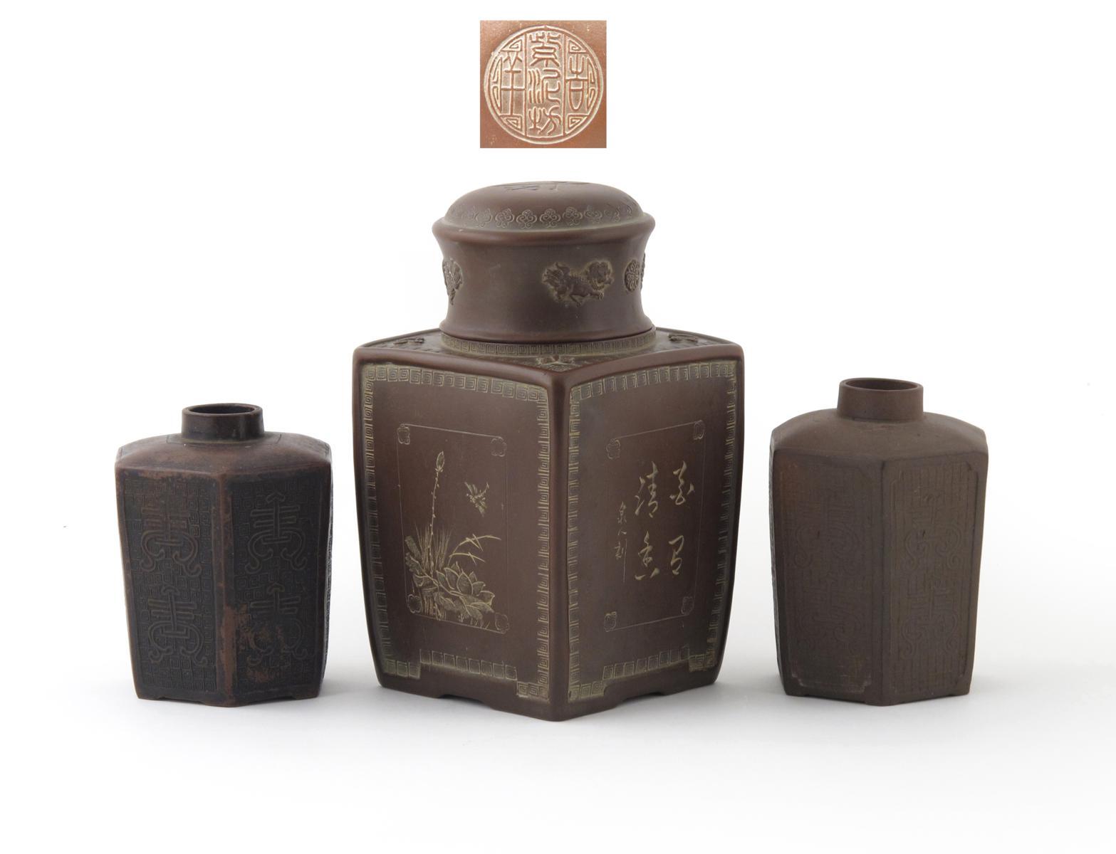 Three Yixing tea canisters 18th century and later, two hexagonal and moulded with stylized characters on a diaper ground, one larger and square section with a cylindrical cover, incised with calligraphy and other scenes, 23cm max. (4)