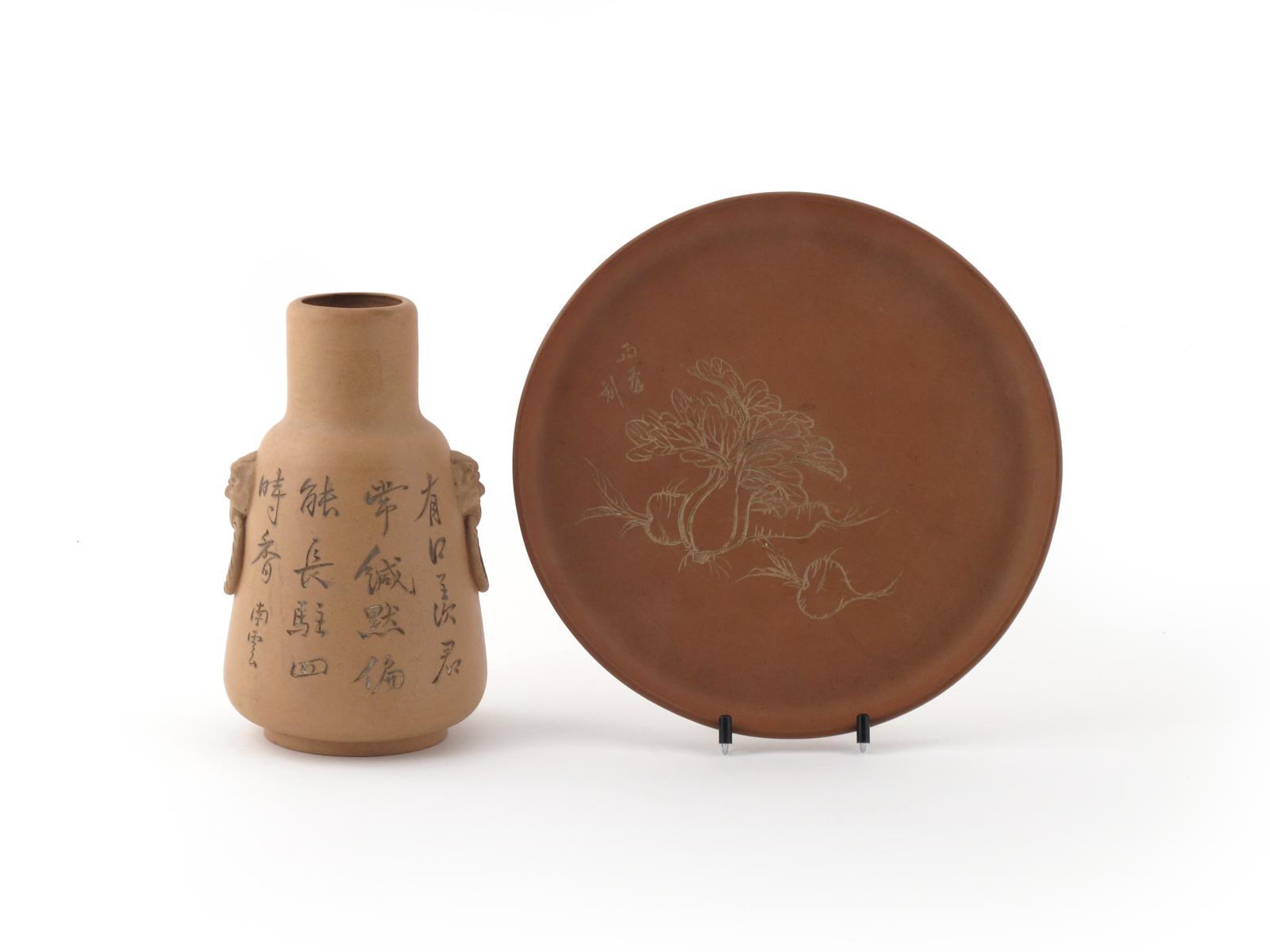 An Yixing vase and a dish 20th century, the vase incised with a landscape scene, the reverse with four columns of calligraphy, the dish incised with vegetables, incised signature and impressed seal mark, 26cm max. (2)