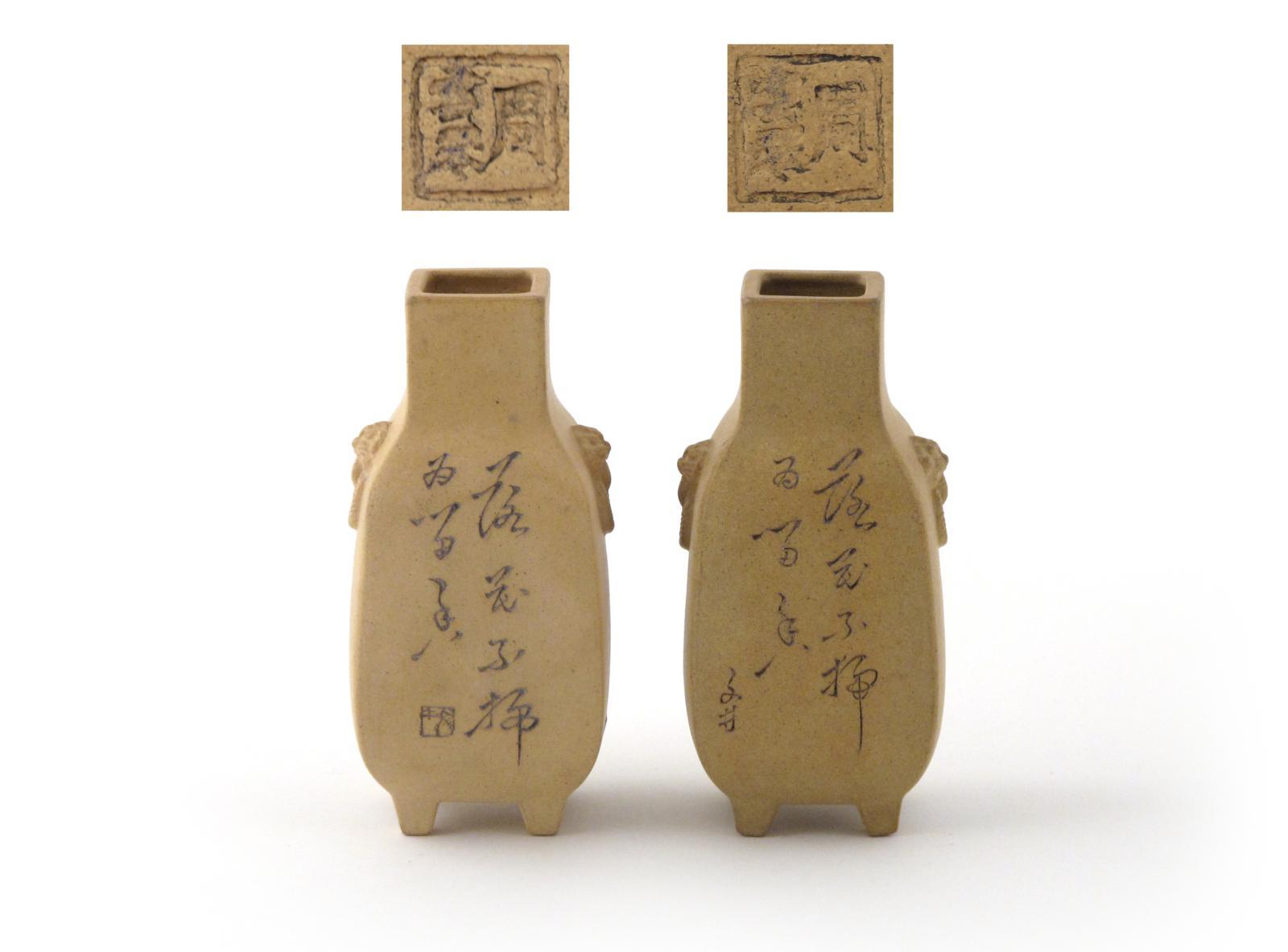 A small pair of Yixing duanni vases 20th century, the pale bodies incised and enamelled with sprays of prunus, the reverses with calligraphy, raised on four feet, square seal marks to each, 14.2cm. (2) Provenance: the Arthur J Harris collection.