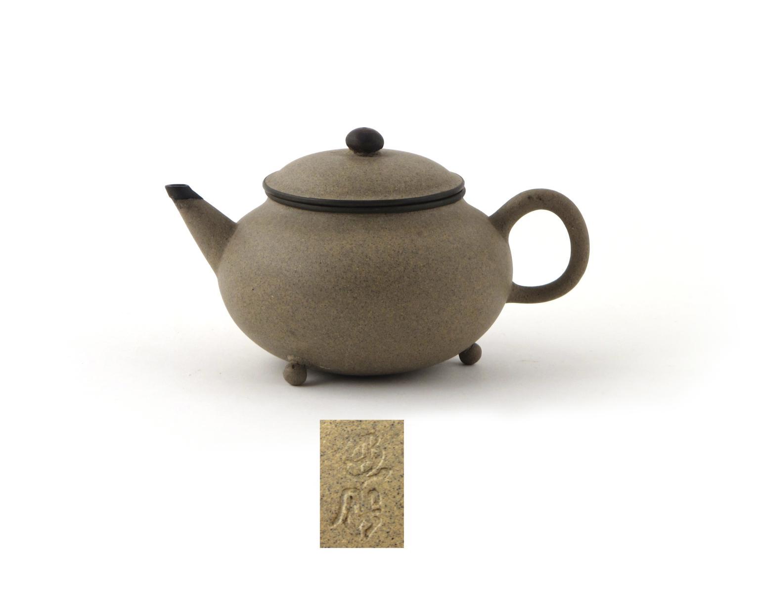 A small Yixing teapot and cover late 19th / early 20th century, for the Thai market, the speckled duanni body raised on three ball feet, the neckrim, cover, finial and spout with metal mounts, impressed Thai characters to the base and cover, 12.2cm. (2)