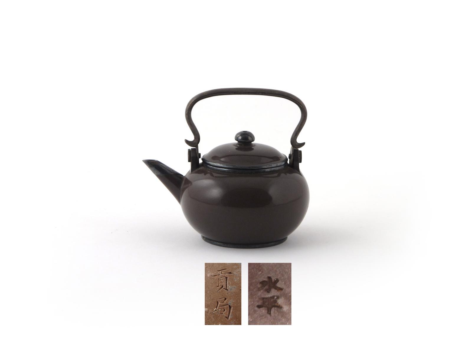 A small Yixing teapot and cover 19th century, for the Thai market, the exterior polished to a high shine, fitted with silvered metal bands to the rim, cover, footrim, finial and spout, two character Gonju mark to the base, shuiping mark to the cover, 9.2cm. (2)
