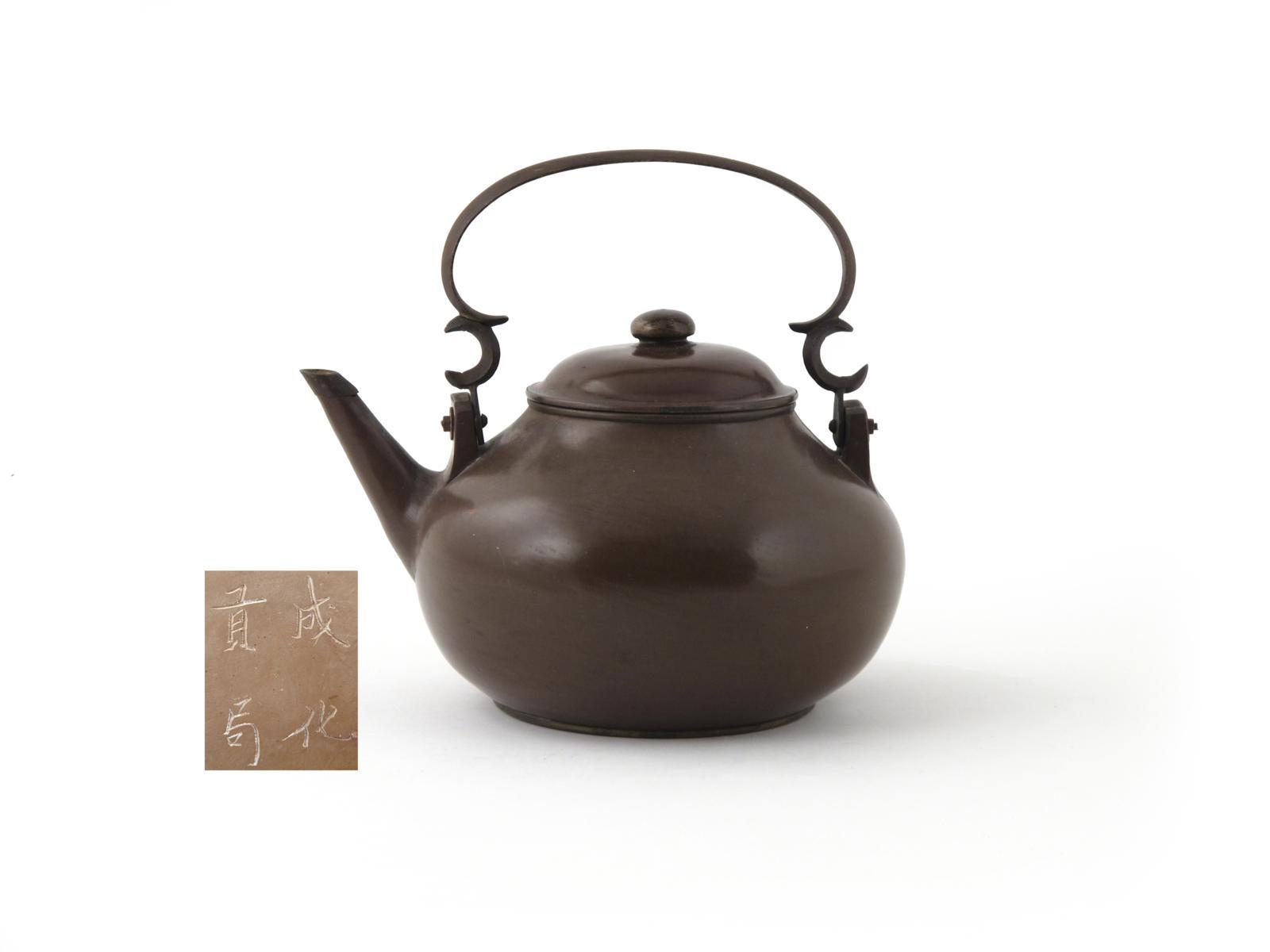 A large Yixing teapot and cover 19th century, for the Thai market, with a polished exterior, metal rim mounts to the rim, spout and footrim, four character script mark to the base, some restoration, 20cm. (2)