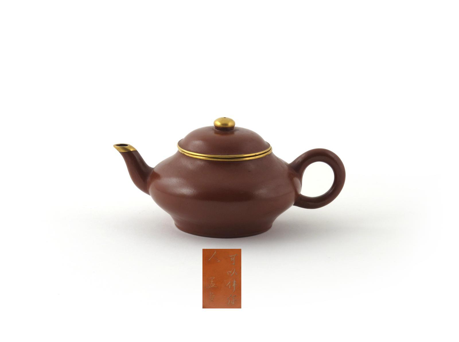 A small Yixing teapot and cover 19th century, for the Thai market, of flattened globular form, the brick red exterior highly polished, the neckrim, cover, finial and spout with gilt metal mounts, three character mark painted to the cover, the base with a seven character calligraphic mark, 14.5cm. (2)