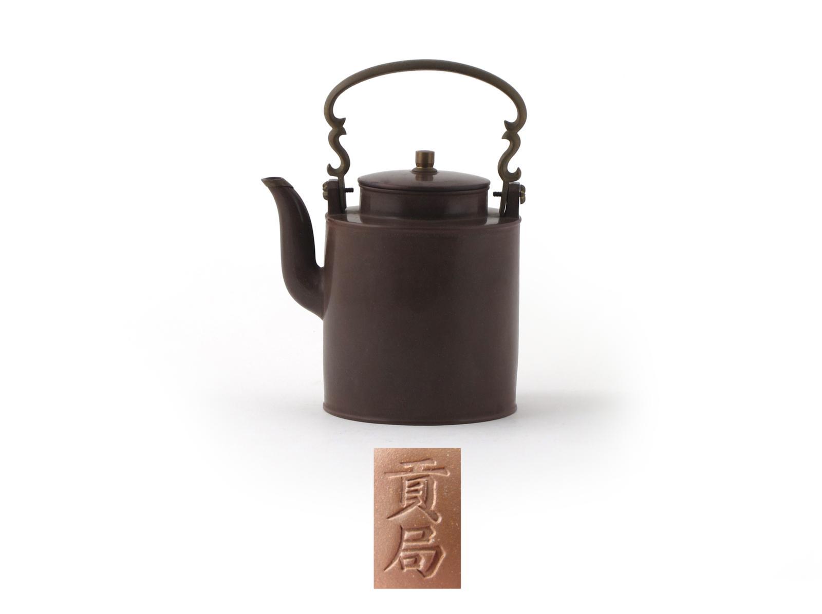 A tall Yixing teapot and cover late 19th century, for the Thai market, the rich brown body highly polished, fitted with a brass overhead handle, two character Gongju mark to the base, 21cm. (2)
