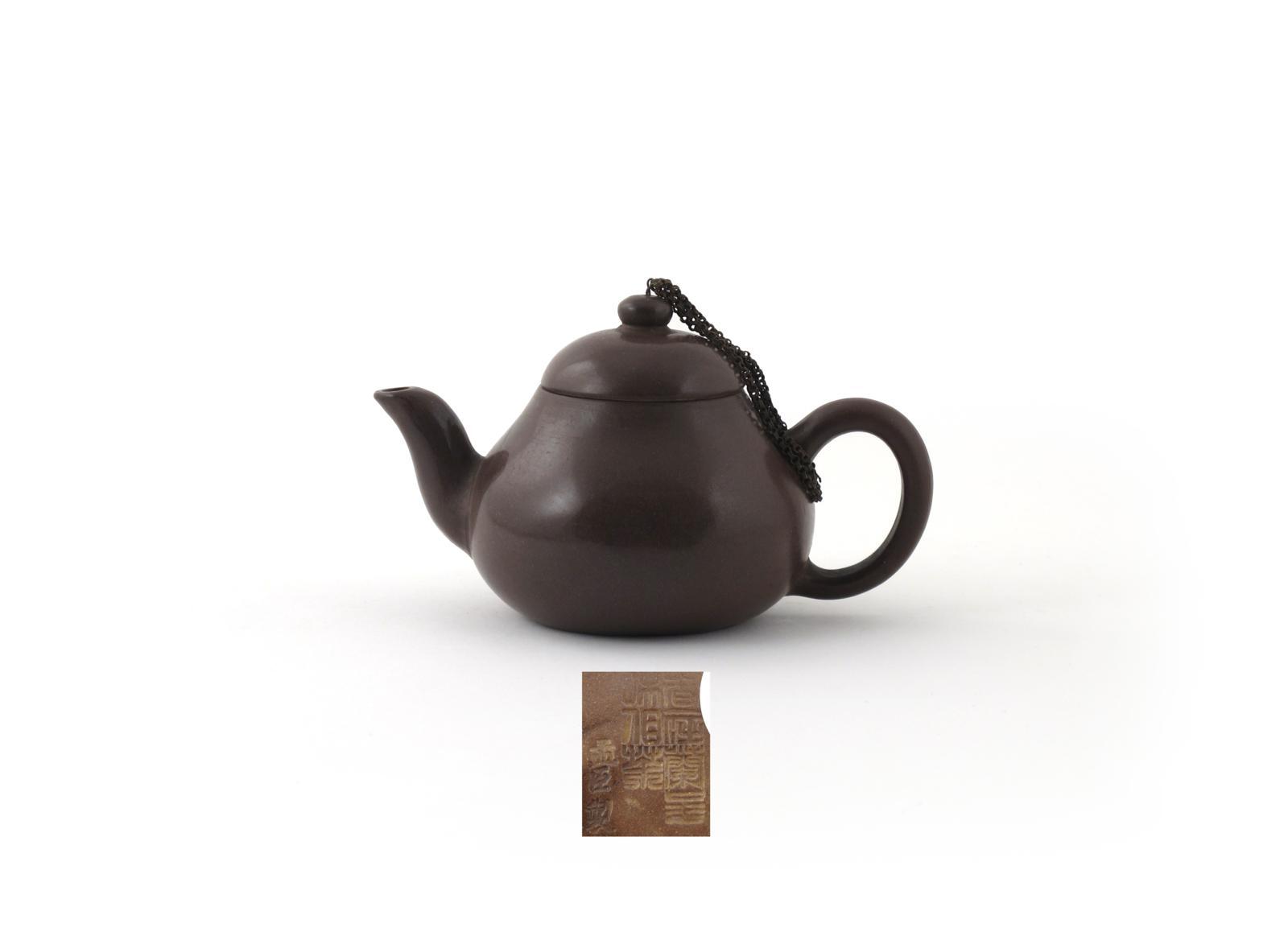 An Yixing teapot and cover 19th century, for the Thai market, the exterior polished to a high shine, impressed marks to the base for Mengchen, a metal chain encircling the handle from the finial, 17cm. (2) Provenance: the Arthur J Harris collection. Illustrated: Patrice Valfré, Yixing Teapots for Europe, no.332.