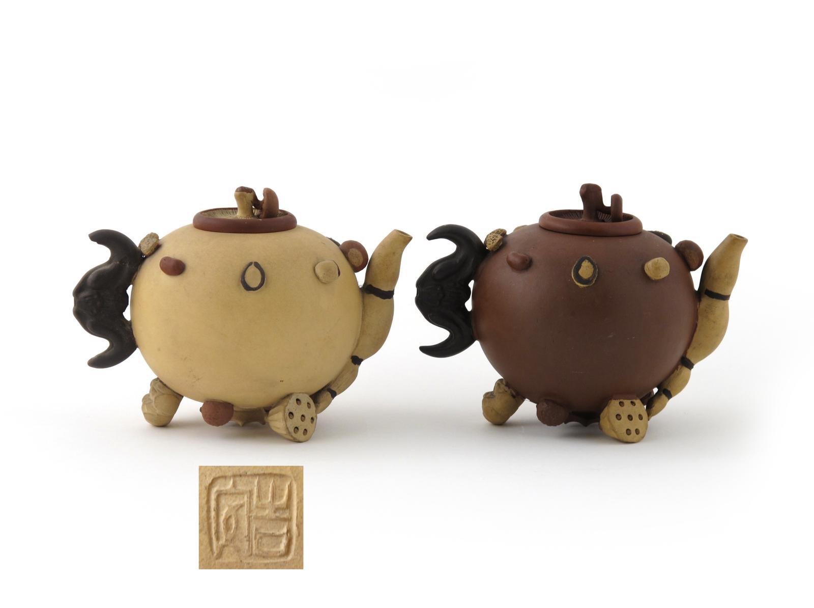 Two Yixing teapots and covers 19th century, applied with a band of seeds and nuts around the shoulders, the feet formed from seed pods and further nut clusters, the covers modelled as mushrooms, 17cm max. (4)