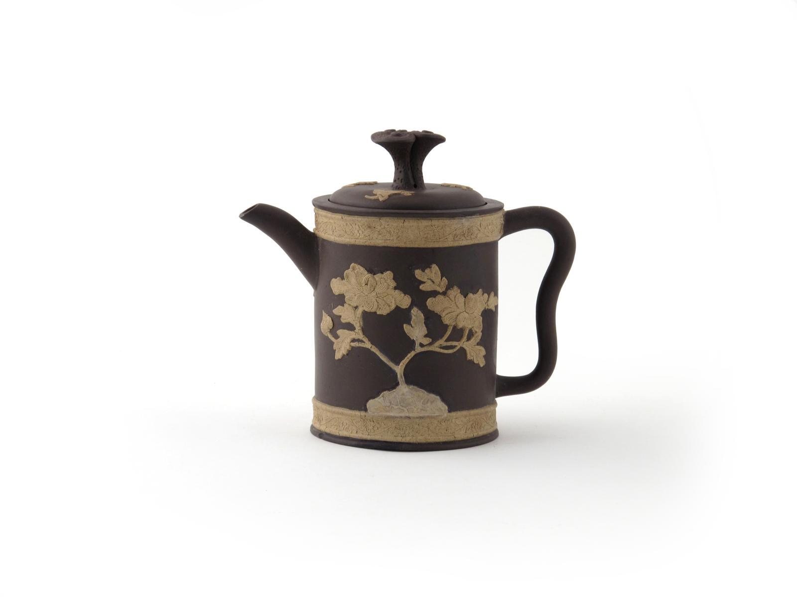 A tall Yixing teapot and cover 18th century, the cylindrical body applied with large peony sprays between horizontal bands, the cover with a ruyi knop, unmarked, some restoration, 19cm. (2)