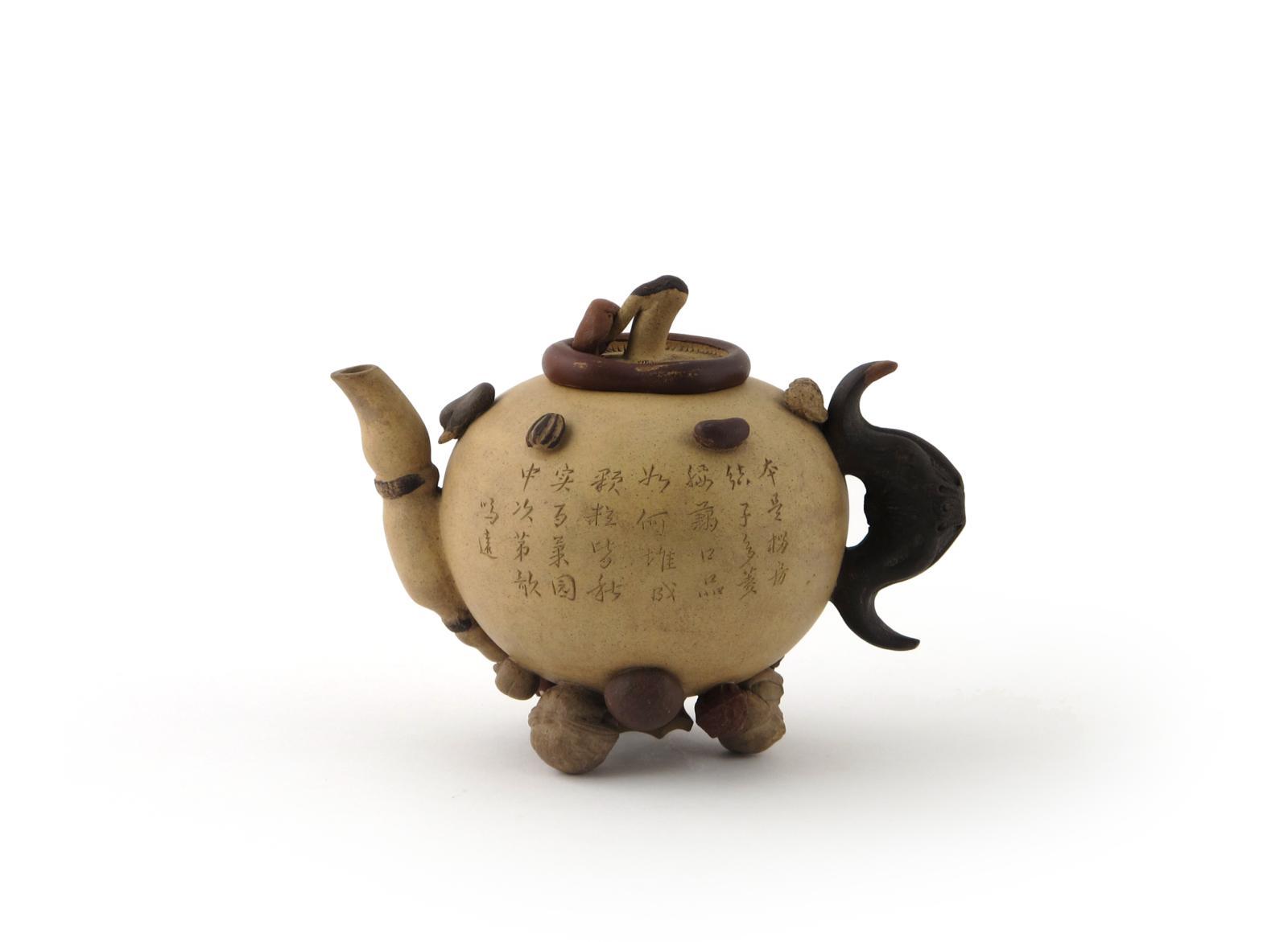 A small Yixing teapot and cover 19th century, the duanni type body applied with seeds and nuts around the shoulders, handle and footrim, the cover formed as an inverted mushroom, 16cm. (2) Provenance: the Arthur J Harris collection. Illustrated: Patrice Valfré, Yixing Teapots for Europe, no.80.