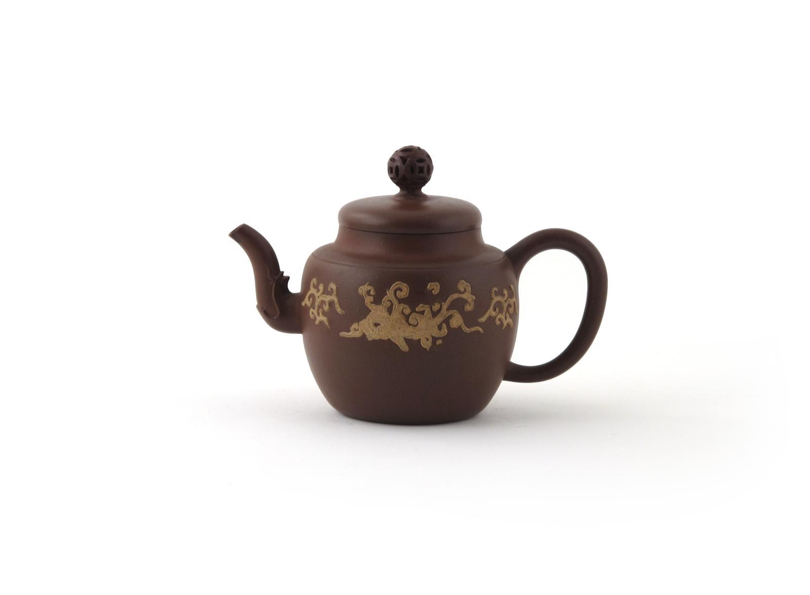 An Yixing teapot and cover 18th century, the globular body applied in cream slip with a scrolling stylized dragon to each side, the cover surmounted with a brocade ball finial, the spout issuing from a moulded animal mask, the cover's finial restored, 18cm. (2)