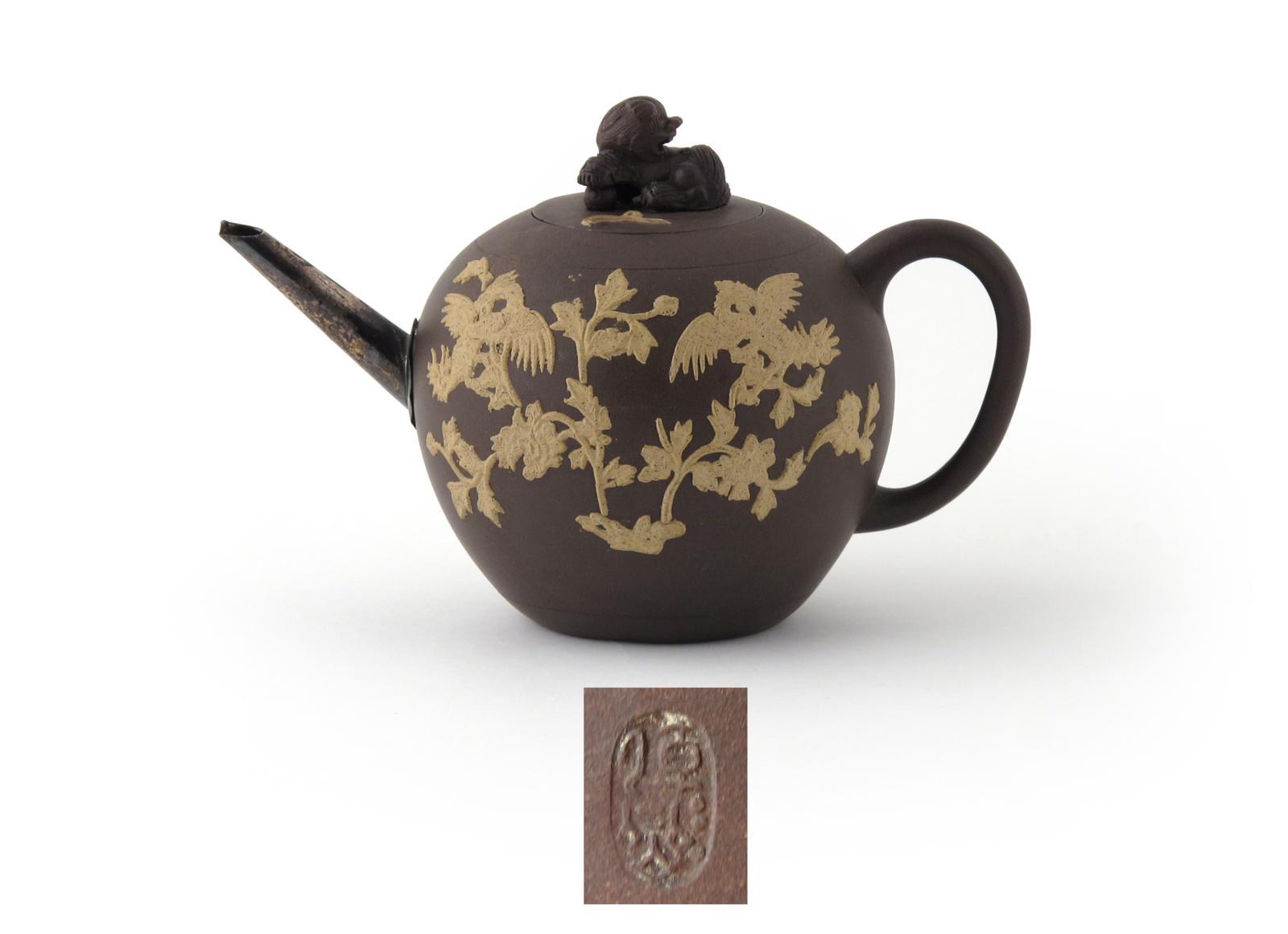 An Yixing teapot and cover mid 18th century, the dark body body applied in cream clay with birds perched on flowering peony branches, the cover with a lion dog finial resting its paw on a brocade ball, impressed mark to the cover, replacement metal spout and damages to the cover, 21cm. (2)