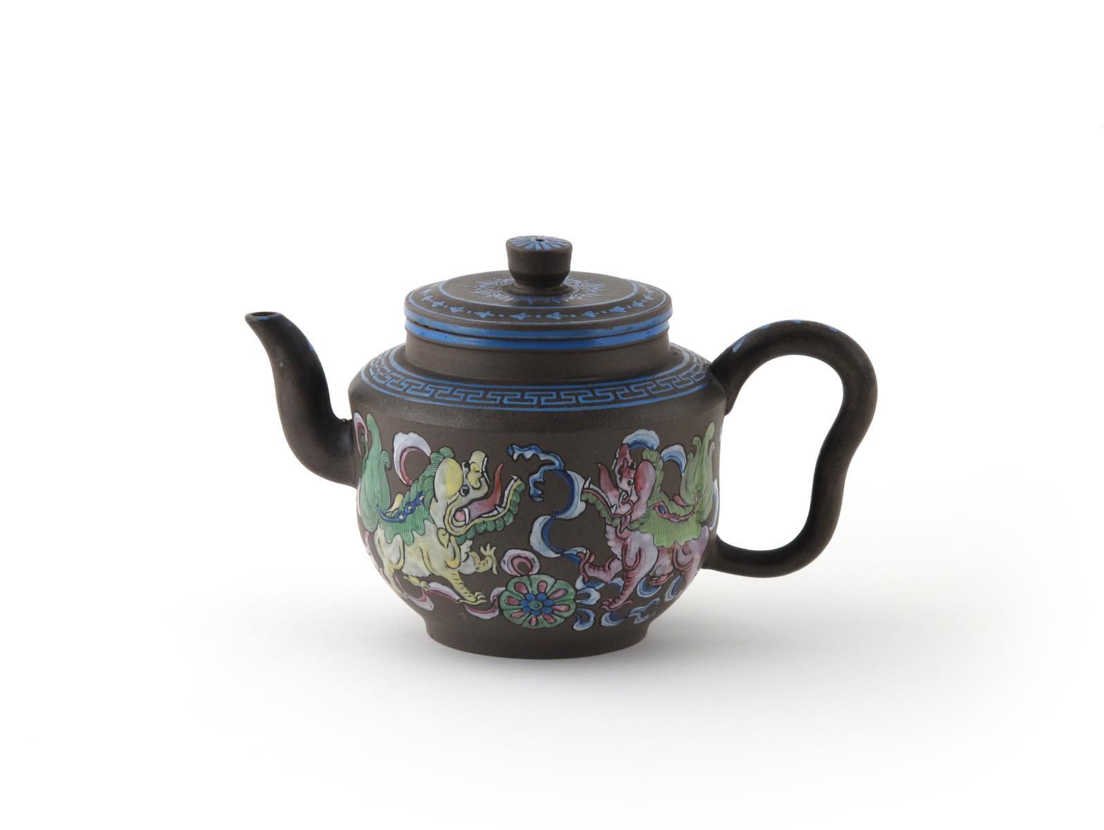 An enamelled Yixing teapot and cover 18th century, each painted in fine detail with two lion dogs playing with a ribboned brocade ball, beneath a geometric blue border, 21.5cm. (2) Provenance: the Arthur J Harris collection. Illustrated: Patrice Valfré, Yixing: Teapots for Europe, no.322. Exhibited: Yixing, L'Art de la Theiere Pourpre, Royal Brussels Museum, April - September 2001.