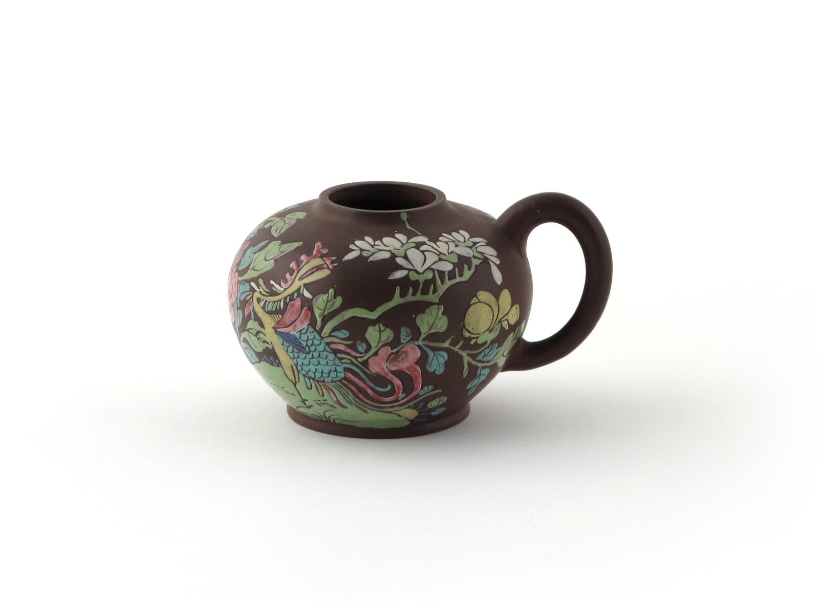 An unusual Yixing one-handled jar 19th century, the globular body enamelled with a phoenix standing amongst native flowers, the cover lacking, 14.5cm. Provenance: the Arthur J Harris collection.