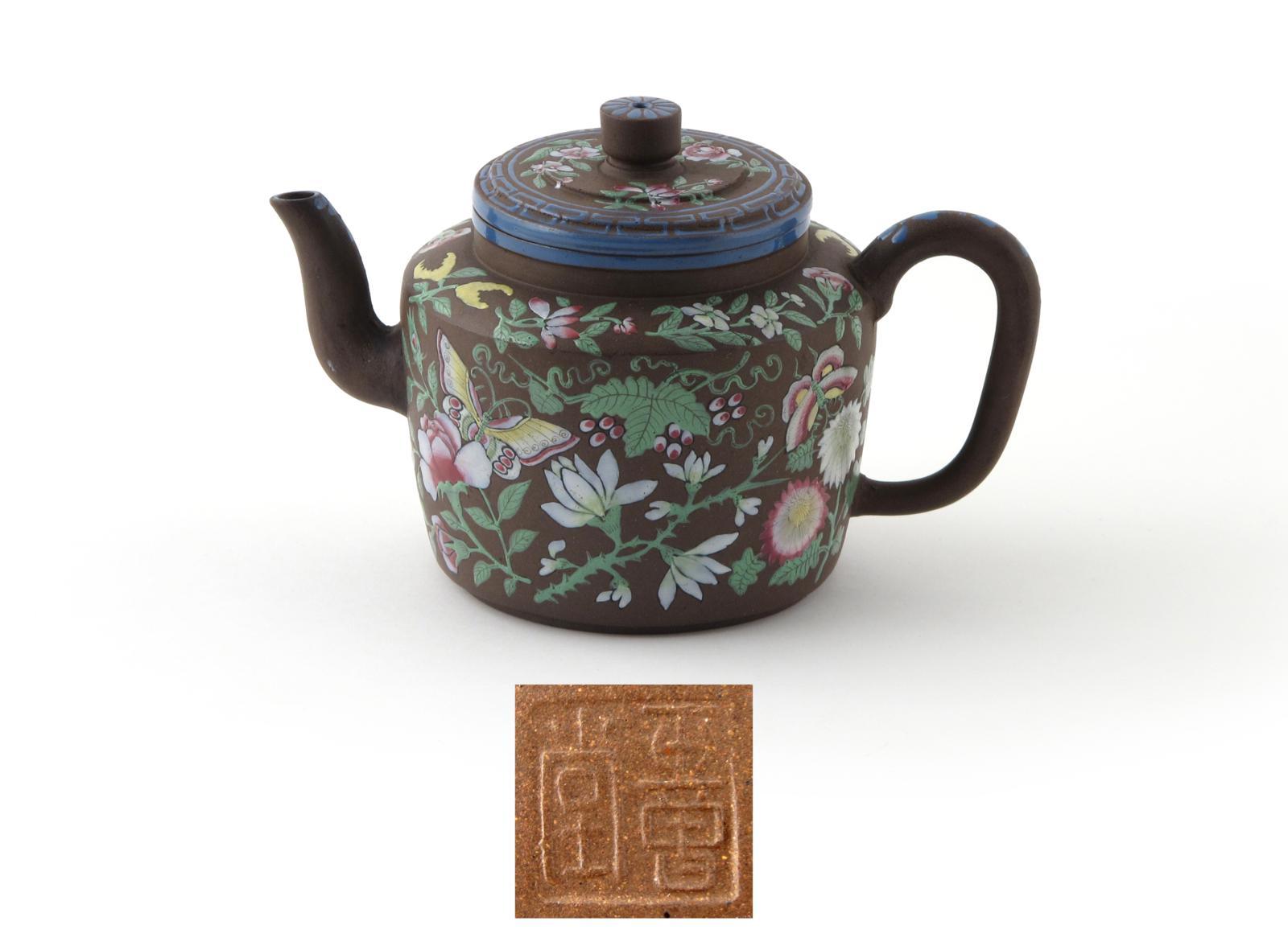 An enamelled Yixing teapot and cover 18th century, boldly painted with an allover design of butterflies amidst various flowers, vine and foliage, impressed seal mark to the base, 21.5cm. (2) Provenance: the Arthur J Harris collection. Illustrated: Patrice Valfré, Yixing Teapots for Europe, no.323. Exhibited: Yixing, L'Art de la Theiere Pourpre, Royal Brussels Museum, April - September 2001.