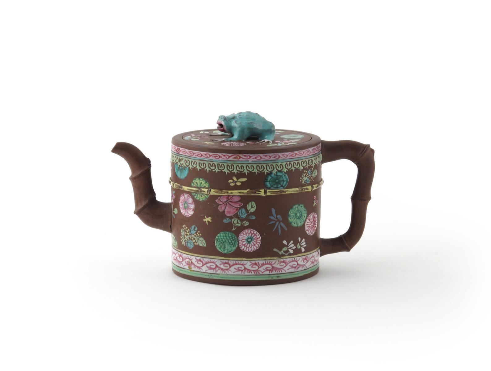 An enamelled Yixing teapot and cover 2nd half 18th century, the oval straight-sided body decorated with bright flowers and roundels around an applied horizontal bamboo band, the cover surmounted with Liu Hai's three-legged toad, 22cm. (2)
