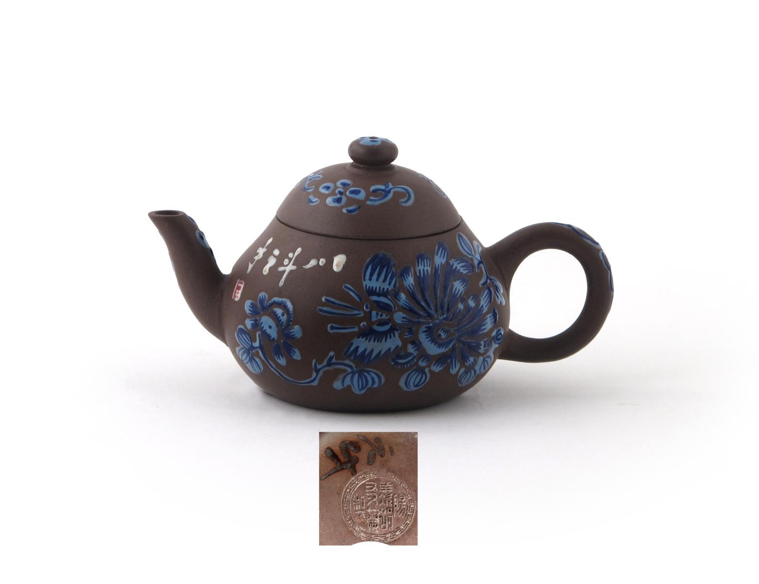 A small Yixing teapot and cover 19th / 20th century, enamelled with blue flowers and with a row of white calligraphy, circular seal mark to the base, the cover with a painted mark, 13cm. (2)