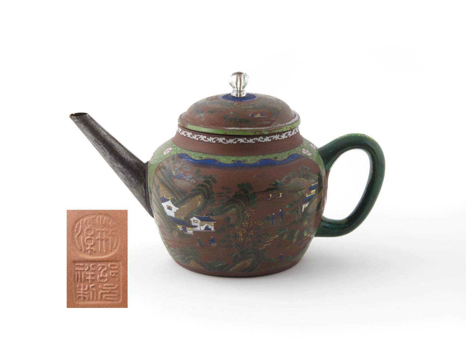 A massive enamelled Yixing teapot 18th century, painted with figures at various pursuits within an extensive landscape, between green diaper panels, impressed seal marks to the base, the spout and finial a replacement, 35.5cm. (2)