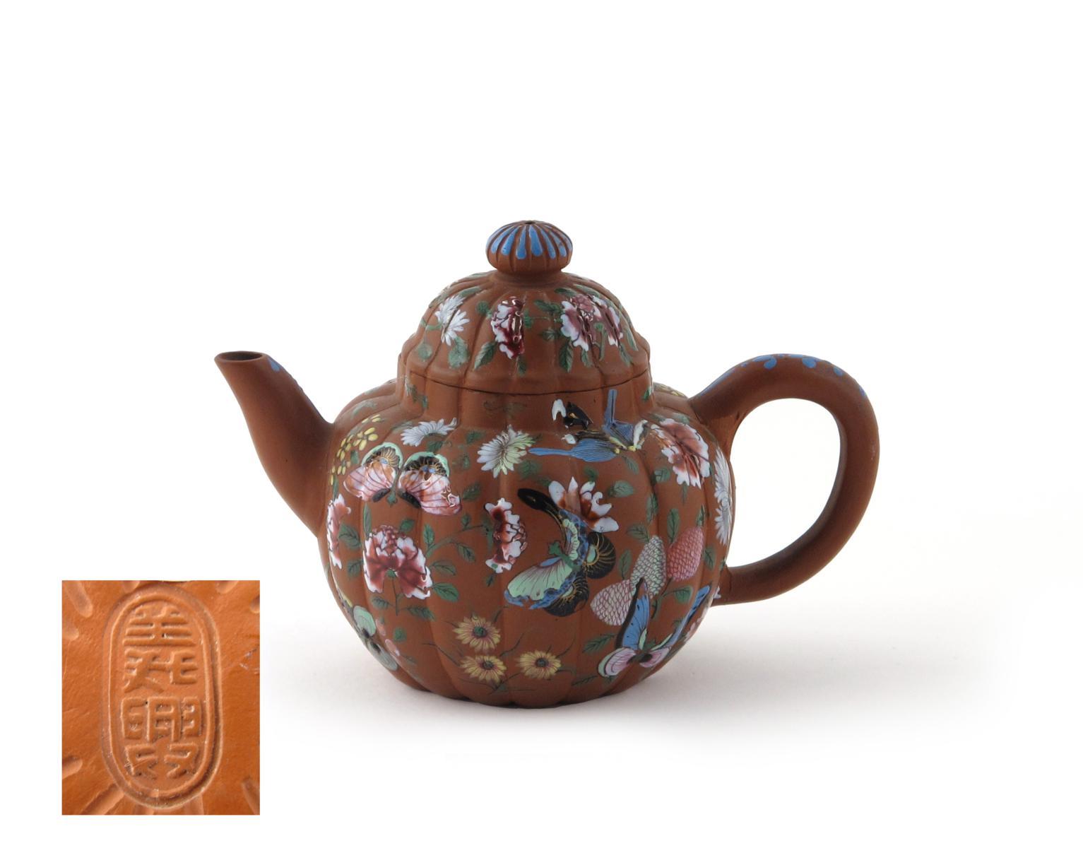 A small Yixing chrysanthemum teapot and cover 19th century, enamelled with butterflies and flowers, the handle and spout detailed in blue, impressed mark to the base, 15cm. (2)