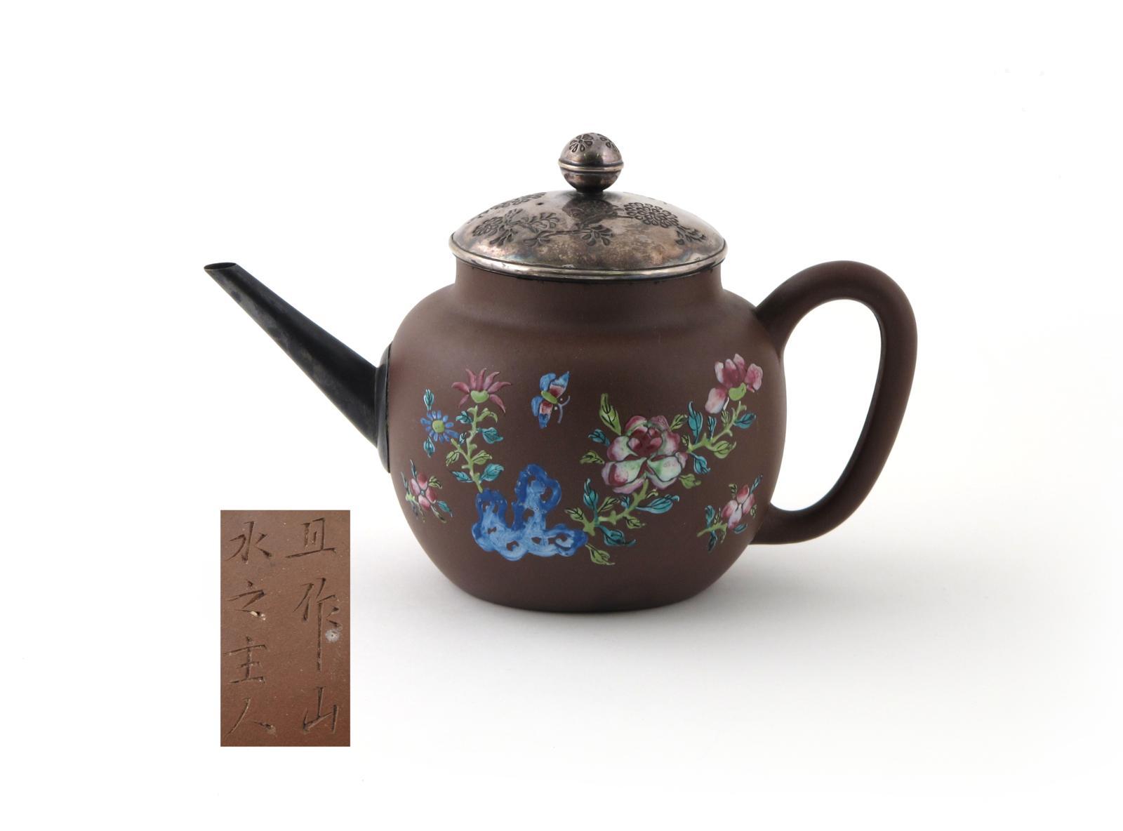 A large Yixing teapot and replacement cover early 18th century, enamelled with butterflies above flowers issuing from rockwork, incised mark to the base, replacement metal spout and cover, 24cm. (2) Provenance: the Arthur J Harris collection. Illustrated: Patrice Valfré, Yixing: Teapots for Europe, no.320.