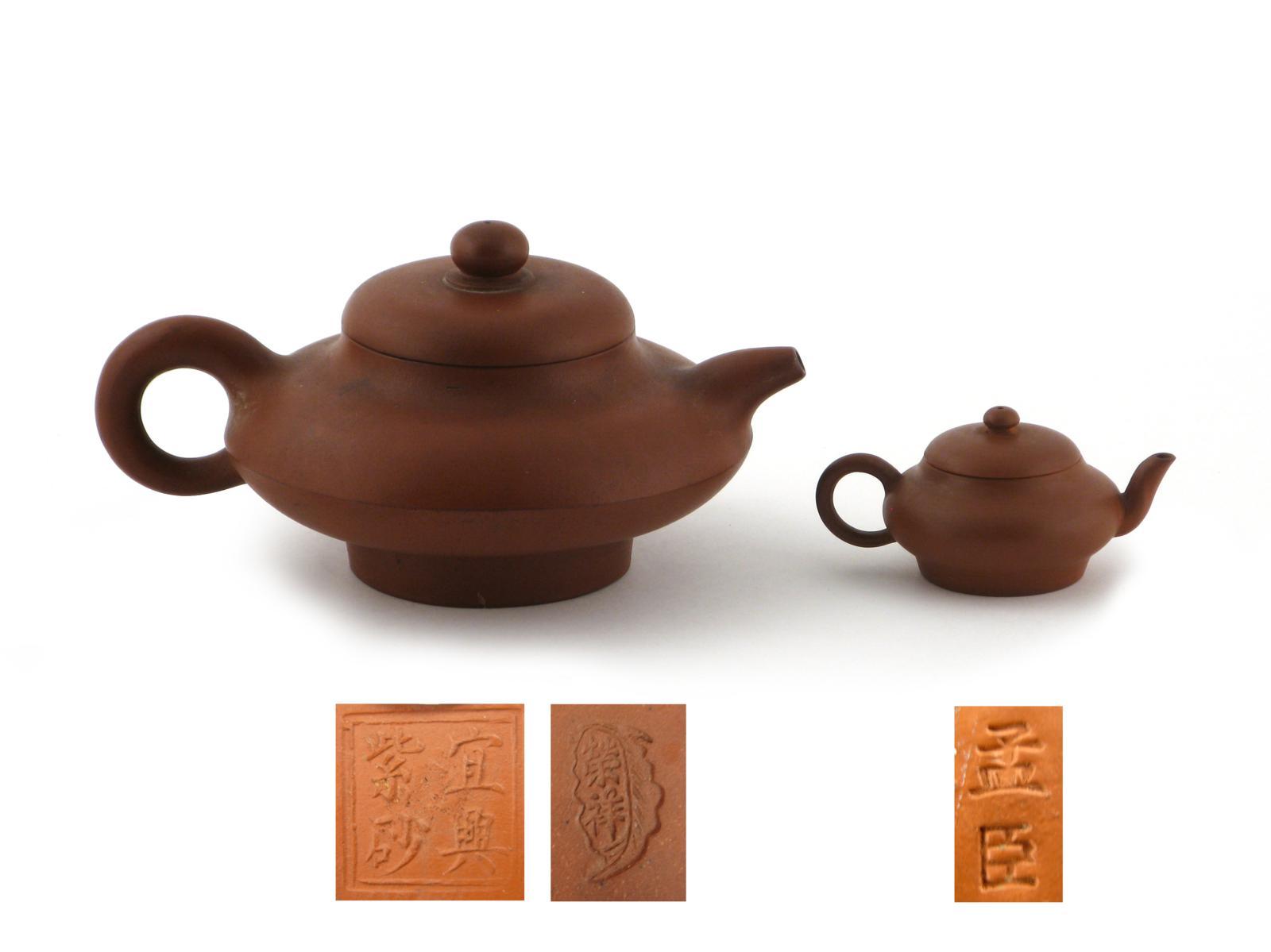 Two Yixing teapots and covers 19th century, one miniature with an impressed Mengchen mark, the other of compressed form with an impressed four character mark and a further mark to the cover, 18.5cm max. (4)