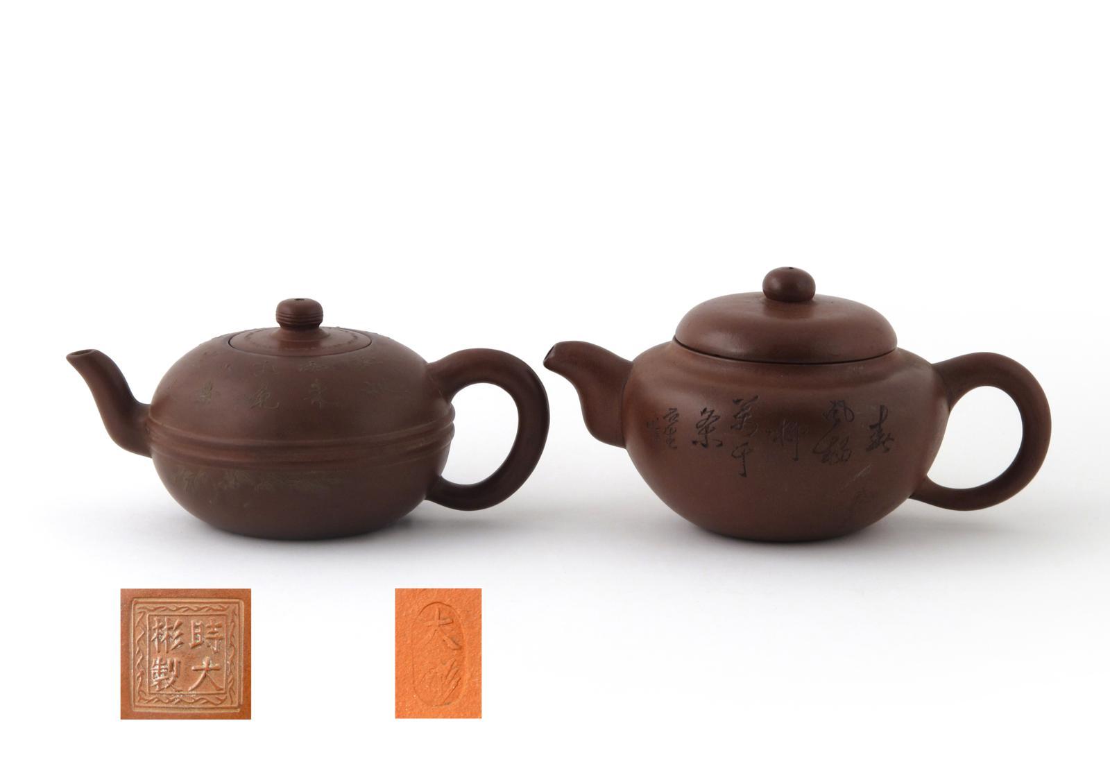 Two Yixing teapots and covers 19th century, the compressed globular bodies incised or enamelled with flowering branches and calligraphy, one with a seal mark, minor damages, 19.5cm. (4) Provenance: the Arthur J Harris collection.