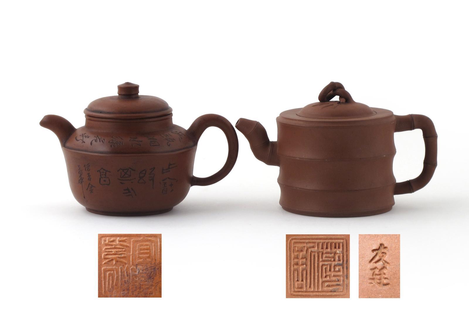 Two Yixing teapots and covers 19th / 20th century, one modelled as a bamboo stem, the other incised with calligraphy and a flowering branch, square seal marks to both bases, one cover with a two character mark, 19.5cm max. (4)