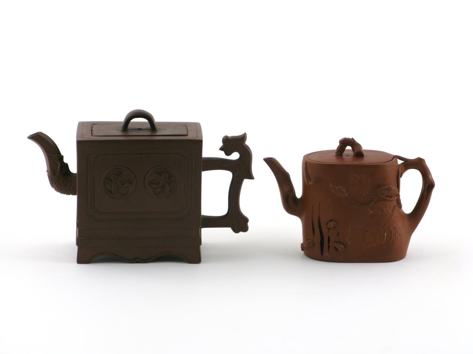Two Yixing teapots and covers 1st half 18th century, one of rectangular form with four bird roundels and a stylized dragon handle, the other formed as part of a tree trunk with squirrels emerging from knotholes, one cover a replacement, 18cm. (4)