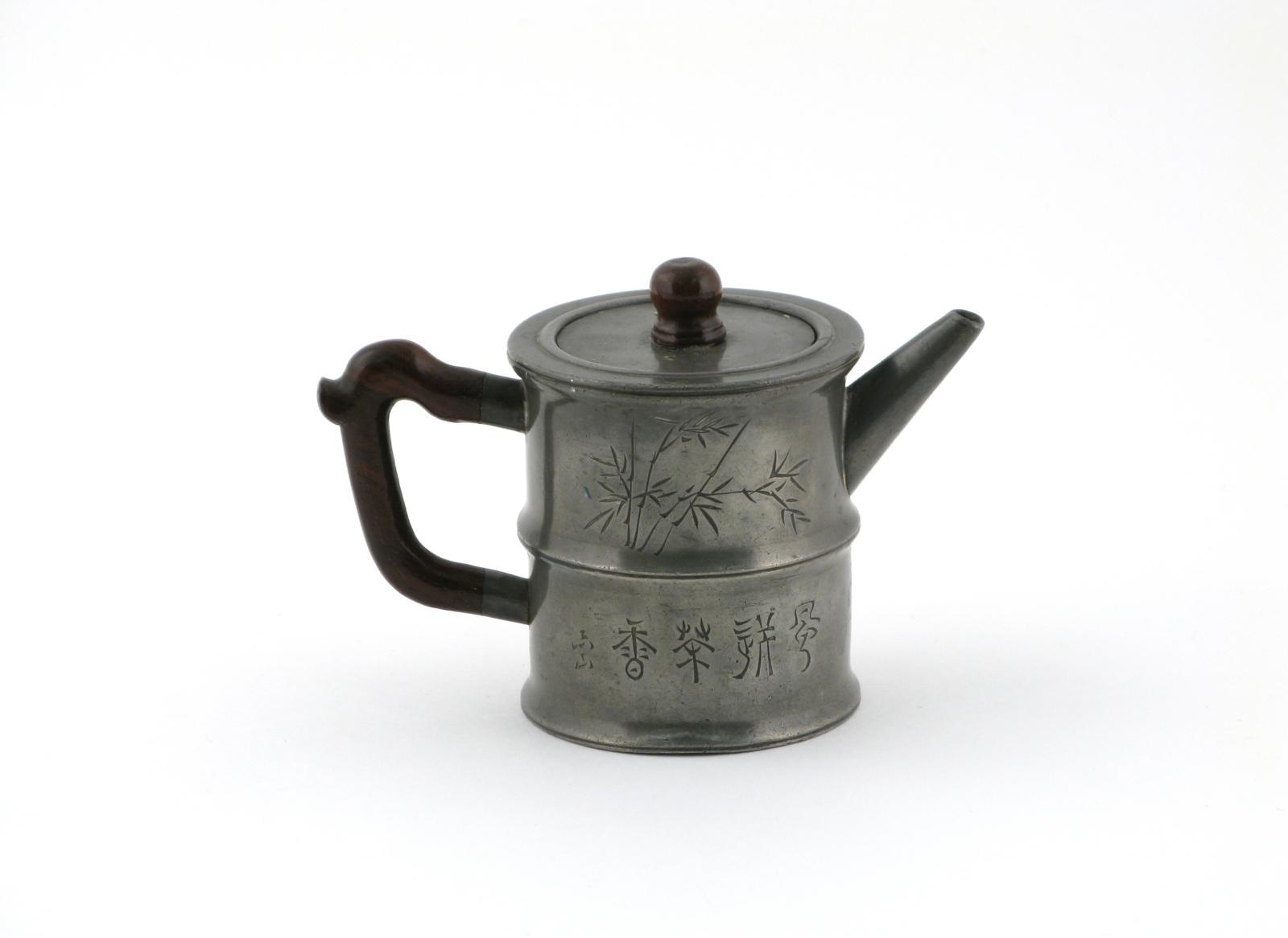 An Yixing pewter-encased teapot and cover 1st half 19th century, the body formed as a bamboo section and incised with bamboo, prunus and calligraphy, the interior with an applied Yang pengnian zhi seal mark, 15.2cm. (2)