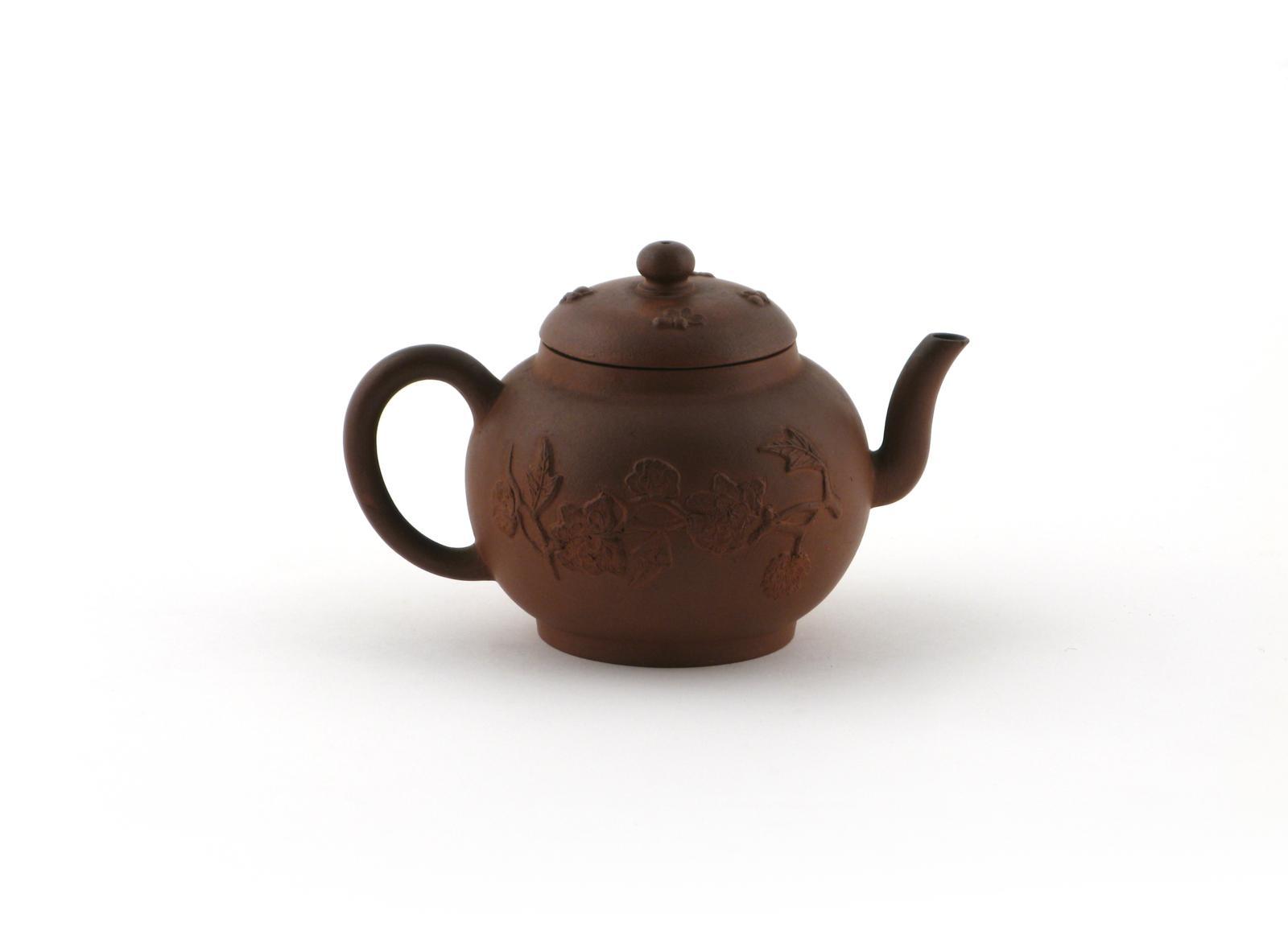 An early Yixing teapot and cover 2nd half 17th century, each side applied with a flowering sprig, the cover with fruits and flowerheads, 13.5cm. (2) Provenance: the Arthur J Harris collection. Illustrated: Patrice Valfré, Yixing Teapots for Europe, no.17. Exhibited: Yixing, L'Art de la Theiere Pourpre, Royal Brussels Museum, April - September 2001.