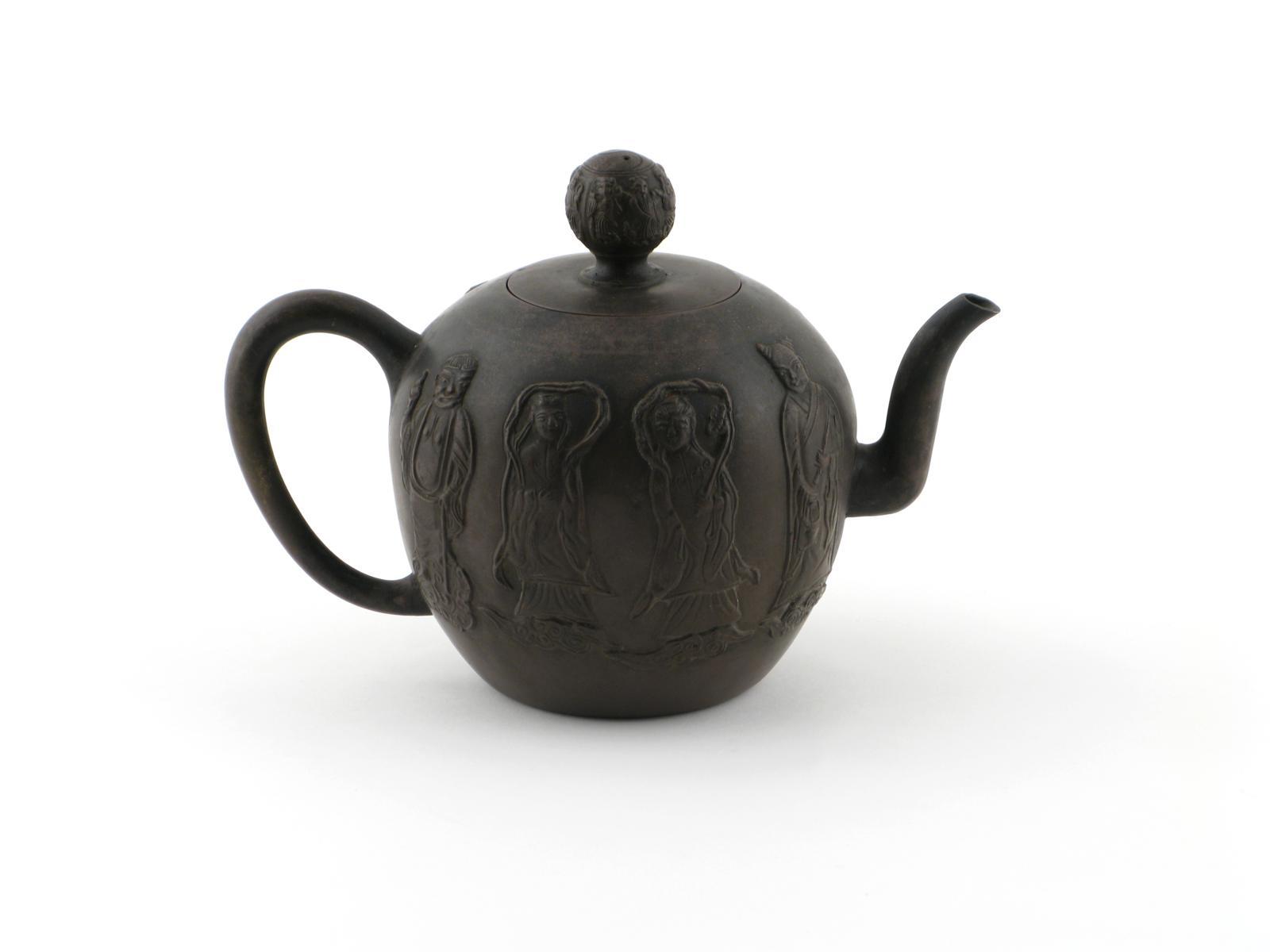 A large Yixing teapot and cover 2nd half 18th century, applied with the Eight Daoist Immortals, the cover's finial with a yin-yang symbol, some restoration, 26cm. (2) Provenance: the Arthur J Harris collection. Illustrated: Patrice Valfré, Yixing: Teapots for Europe, no.51. Exhibited: Yixing, L'Art de la Theiere Pourpre, Royal Brussels Museum, April - September 2001.