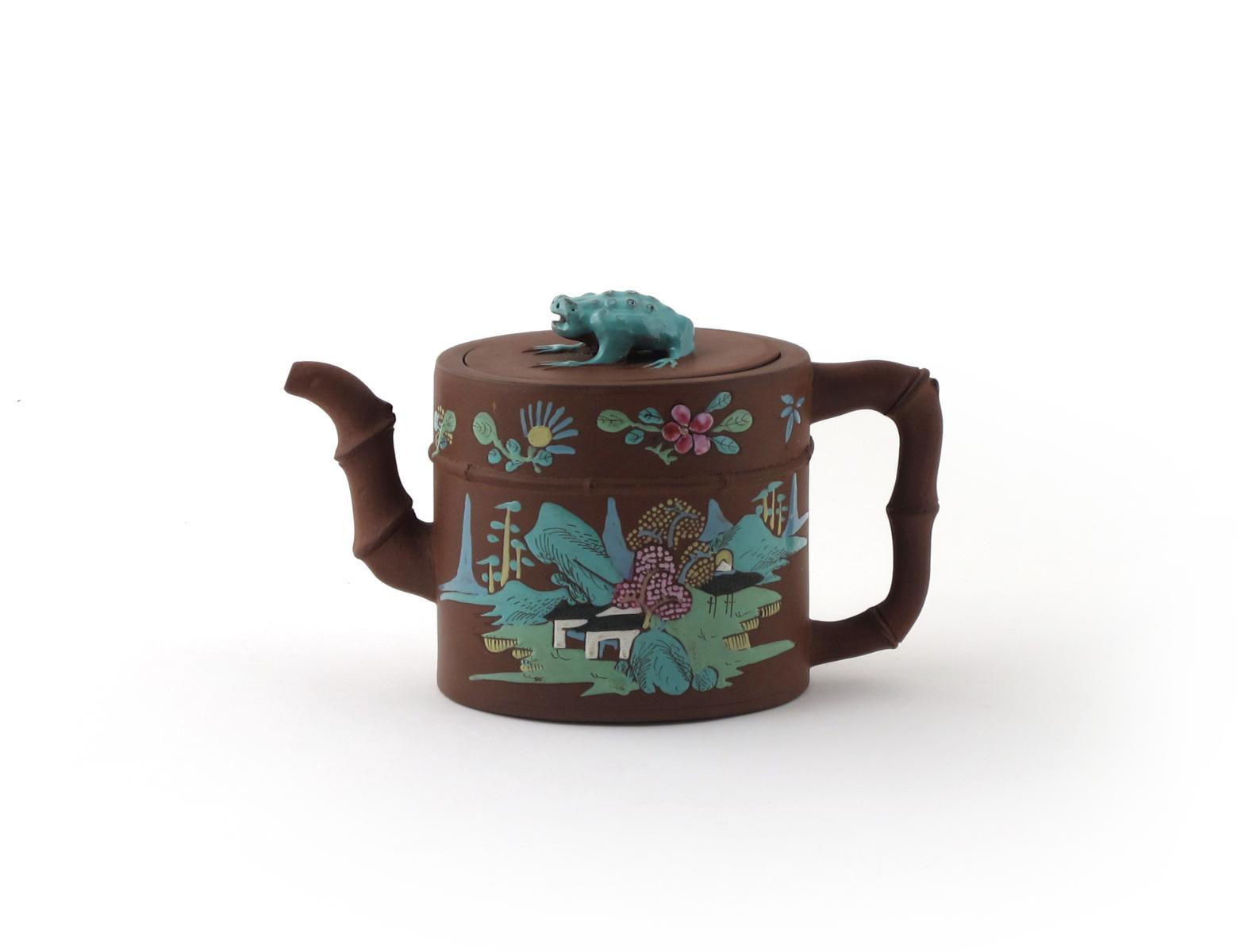 A large Yixing enamelled teapot and cover 2nd half 18th century, each side painted with trees and buildings in a mountainous landscape, the neck with flowers and a tied gourd, Liu Hai's toad forming the cover's finial, 22cm. (2) Provenance: the Arthur J Harris collection. Illustrated: Patrice Valfré, Yixing Teapots for Europe, no.58.