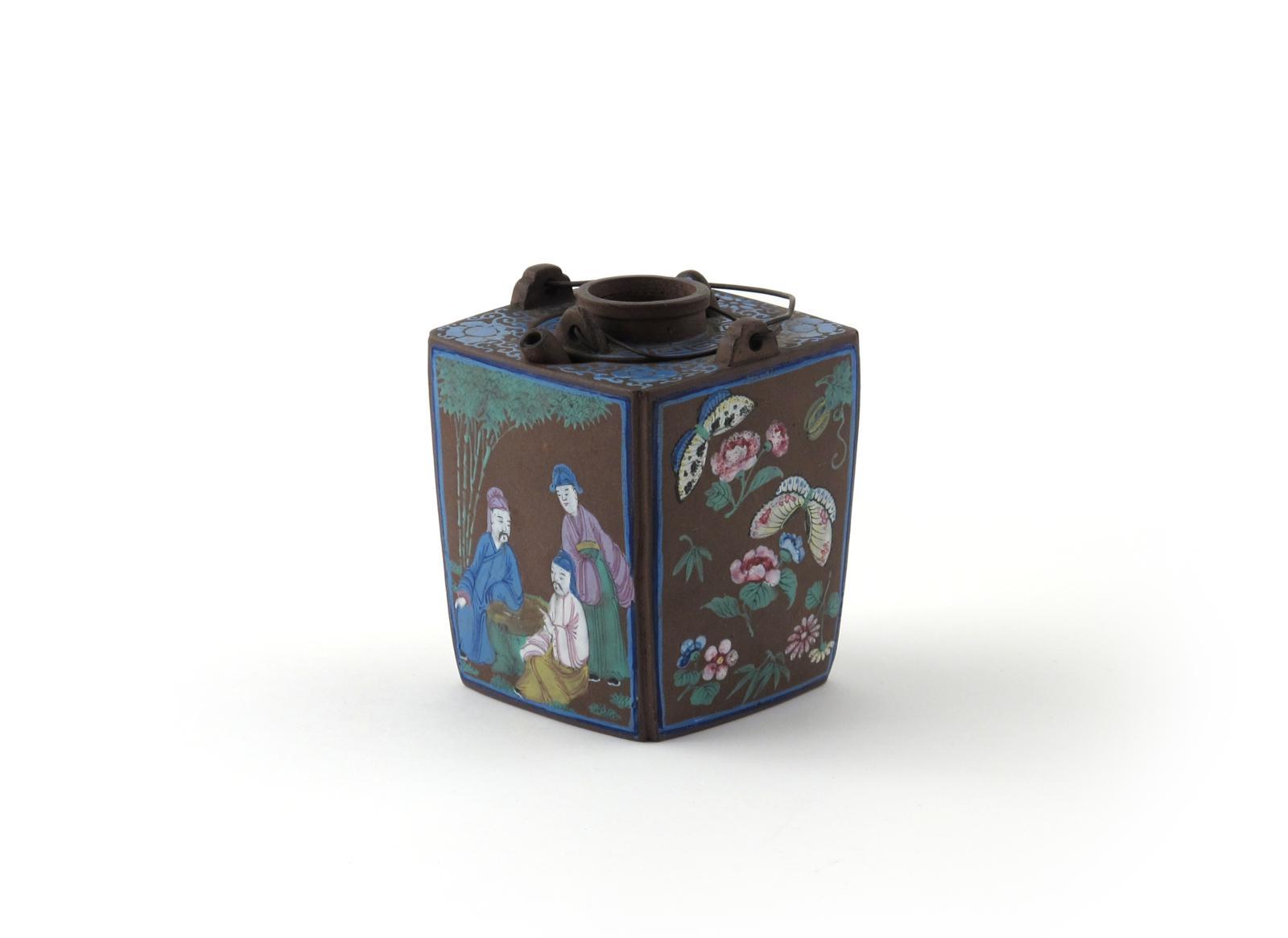 A small Yixing teapot with external warmer 19th century, the narrow cylindrical body fitted without a square section flask enamelled with figures in garden scenes to two sides, butterflies and flowers elsewhere, the cover lacking, 11cm. (2) Provenance: the Arthur J Harris collection. Illustrated: Patrice Valfré, Yixing: Teapots for Europe, no.101.
