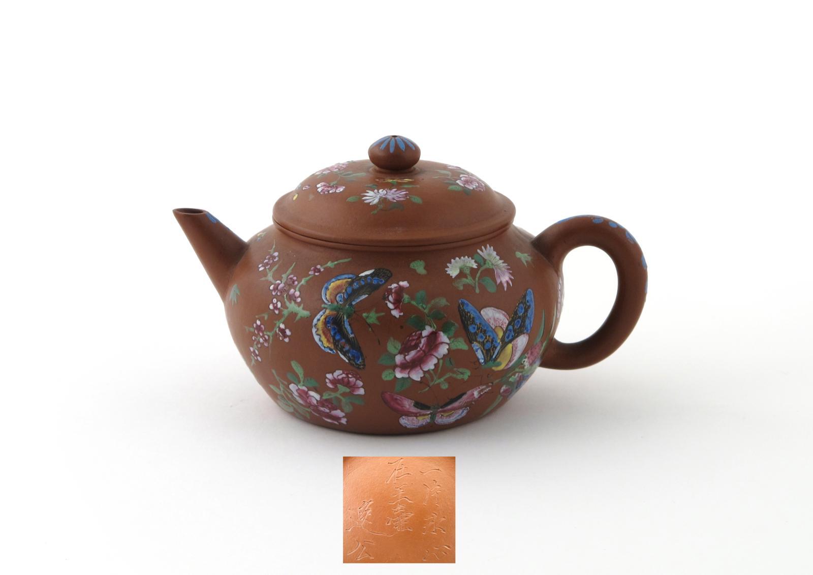 An enamelled Yixing teapot and cover 19th century, painted with large butterflies in flight amidst prunus, peony and chrysanthemum, incised mark to the base, 15.5cm. (2) Provenance: the Arthur J Harris collection.