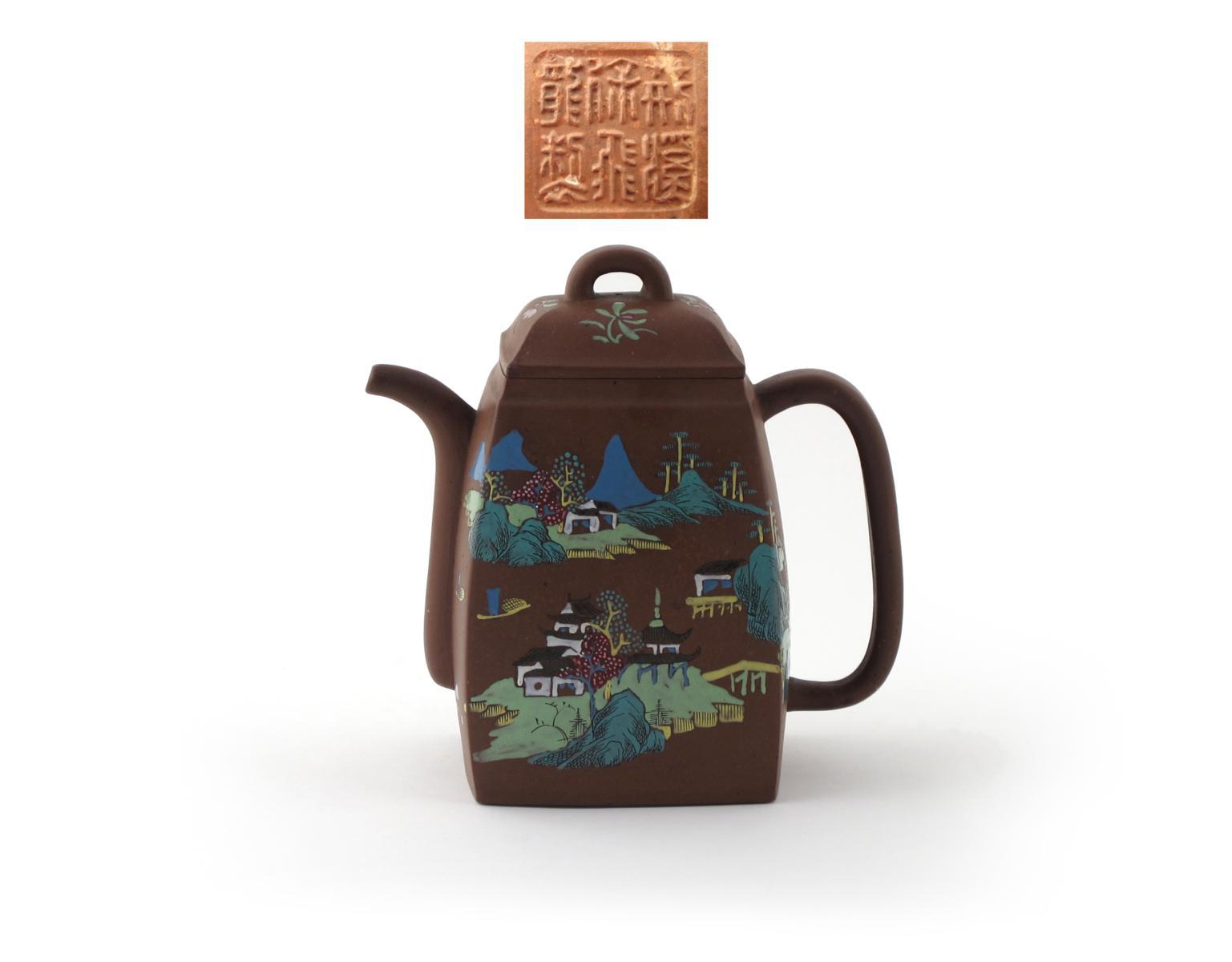 A large Yixing teapot and cover 2nd half 18th century, the tall square-section body enamelled with pagodas in a landscape scene, impressed square mark to the base for Jing Xi Xu Fei Long Zhi, some damages, 20cm.