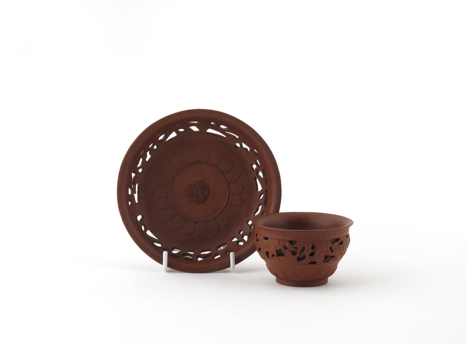 An early Yixing teabowl and saucer late 17th / early 18th century, the double walled teabowl pierced with the Three Friends of Winter, the saucer with a reticulated border around a band of stiff leaves, a little restoration to the saucer's application, 12.6cm. (2)