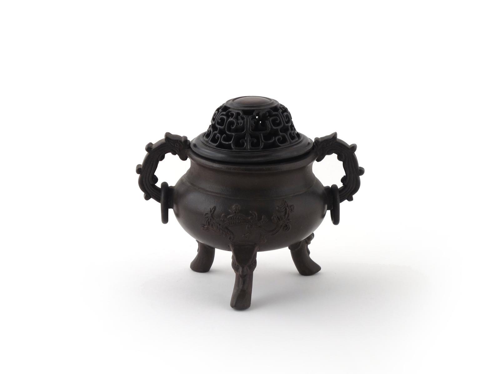 A small Yixing tripod censer and wooden cover 18th century, after the bronze, applied with scrawny stylized dragons and raised on three tall feet issuing from open mouthed masks, the dragon handles with loose rings, 18cm. (2)