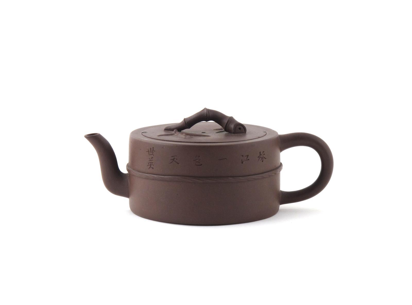 An Yixing teapot and cover 2nd half 18th century, the drum-shaped body a rich chocolate brown, the cover with a bamboo moulded finial, 19cm. (2) Provenance: the Arthur J Harris collection.