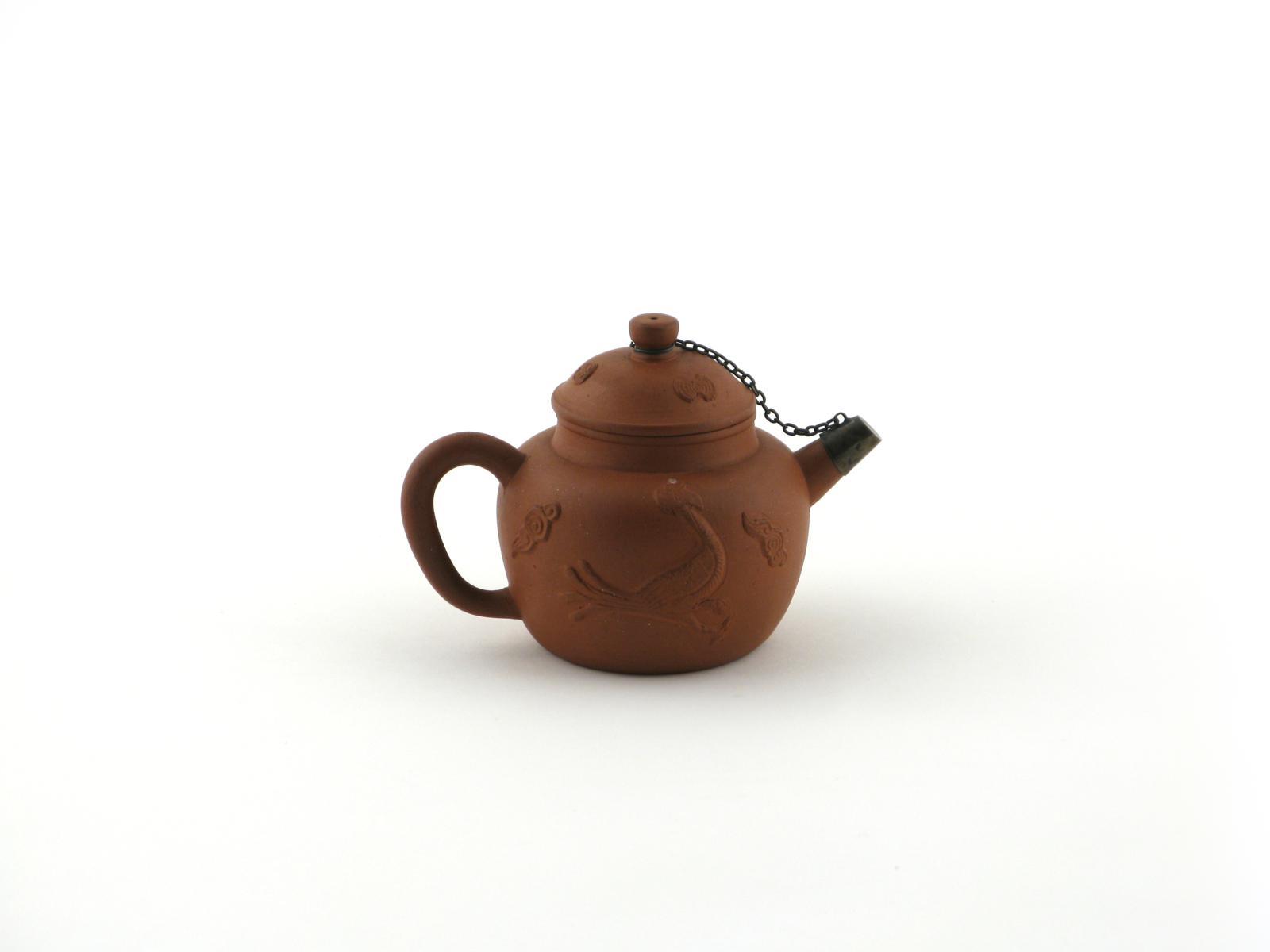 A small Yixing teapot and cover 17th century, one side applied with a cockerel amongst stylized cloud scrolls, the reverse with a prunus spray, the spout with a removable metal cap attached to the cover finial by a chain, 13cm. (2)