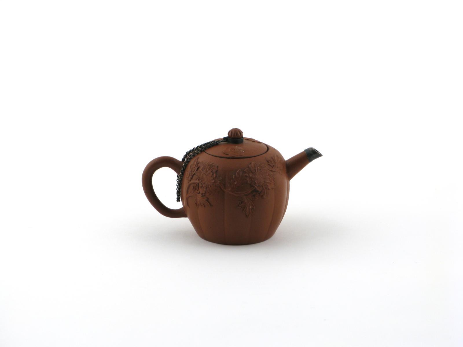 A small Yixing teapot and cover 17th / 18th century, the lightly lobed form applied with finely detailed chrysanthemum sprays, the spout and finial with metal bands, a chip to one side of the applications, 14cm. (2)