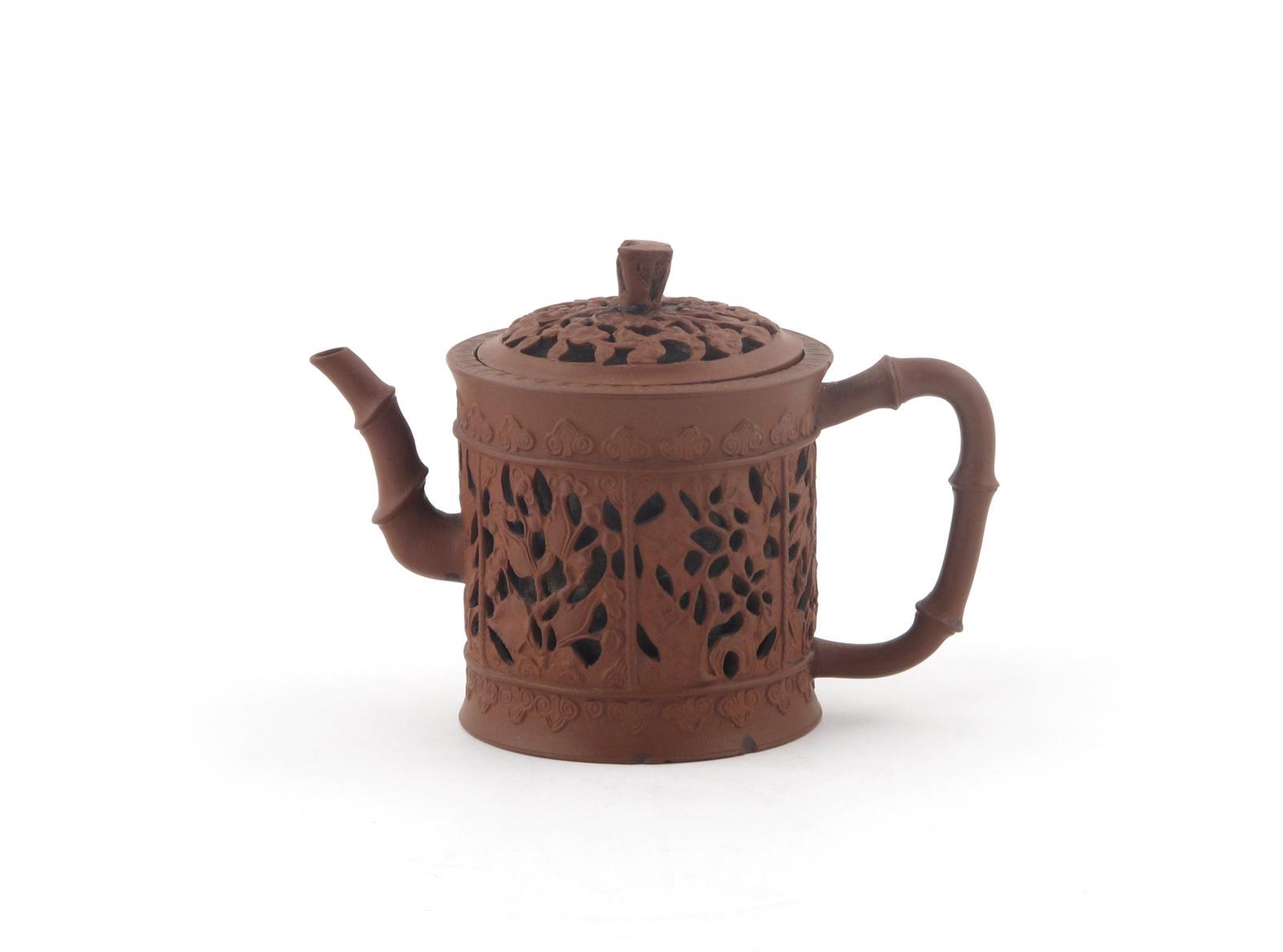 A cylindrical double-walled Yixing teapot and cover 18th century, decorated with six panels of foliage including bamboo, pine and prunus, between bands of ruyi heads, the handle and spout moulded as bamboo, unmarked, the finial broken and loose, 16cm. (2)