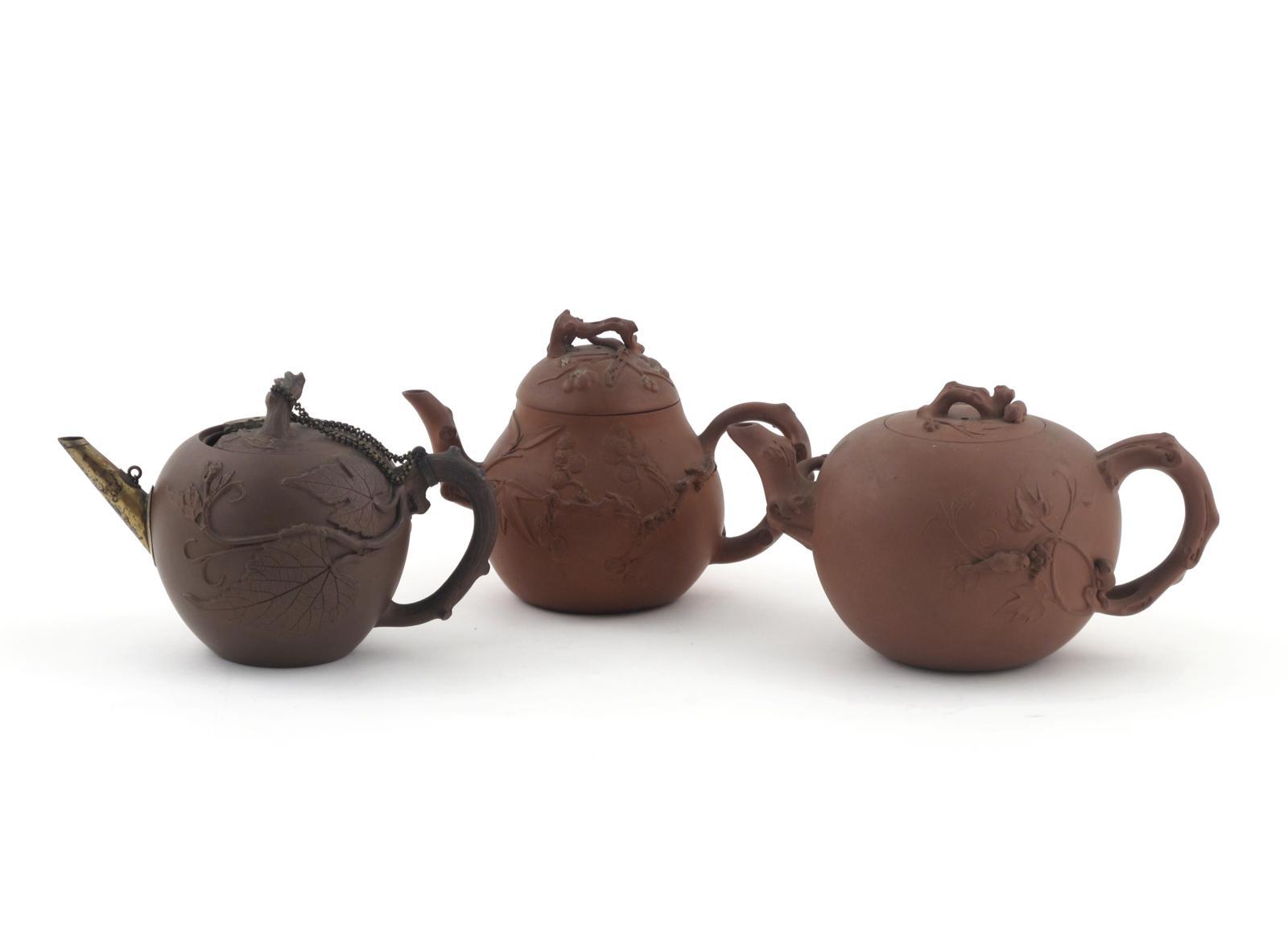 Three Yixing teapots and covers 18th century, two globular and applied with squirrels and grapevine, the other pear-shaped and applied with prunus, pine and bamboo, some enamelling to the cover of the latter, one cover with a two character impressed mark, some damages and losses, 20cm max. (6)