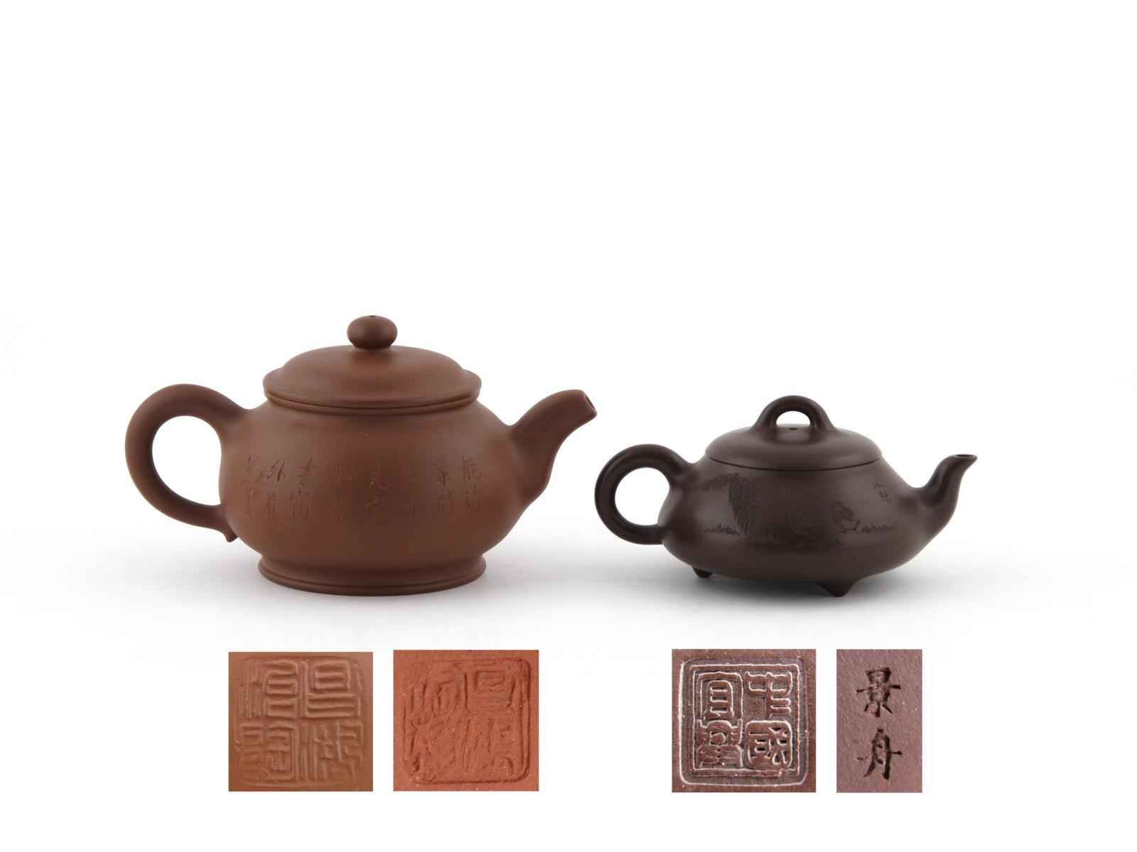 Two Yixing teapots and covers 20th century, one chocolate brown and raised on three small feet, incised with calligraphy and two quail beneath palm fronds, the other with bamboo and calligraphy, impressed marks to the bases and to the covers, 18cm max. The latter in a fitted box with a certificate and photograph of the potter. (5)