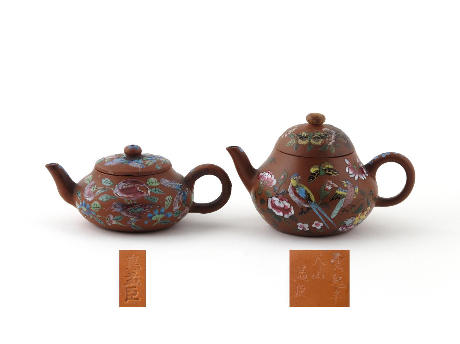Two miniature Yixing enamelled teapots and covers 19th century, painted with birds and butterflies amidst flowers, one with a three column script mark, the other with a three character mark, some damages to the covers, 11cm. (4)