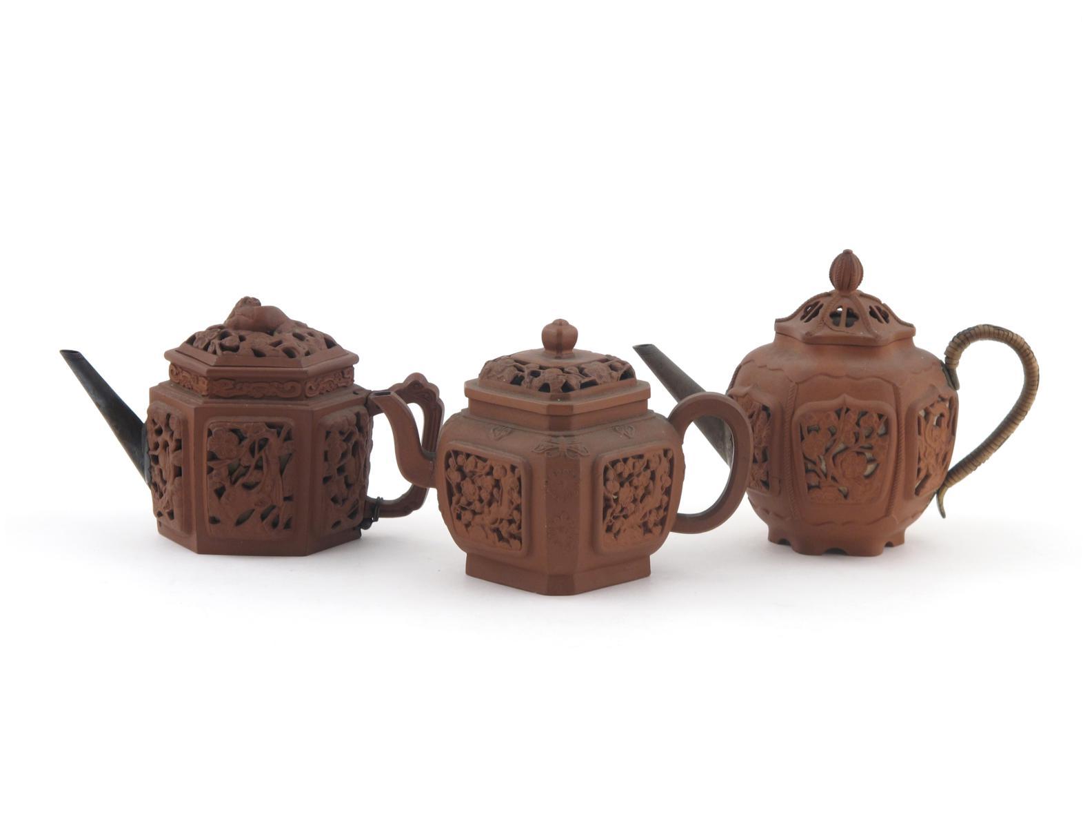 Three Yixing teapots and covers 18th century, two hexagonal and one square section, all pierced with panels of prunus, pine and other flowers, some replacement spouts and one handle, unmarked, 18cm mjax. (6)