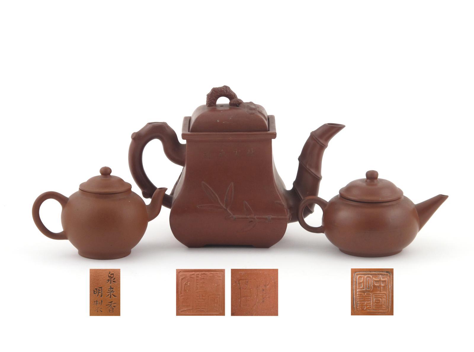 Three Yixing teapots and covers, two small and of traditional shape, one with a square seal mark, the other with a five character calligraphic mark, the third square-section with tall undulating sides, the prunus handle, pine finial and bamboo spout denoting the Three Friends of Winter, impressed marks to the cover and base, 20cm max. (6)