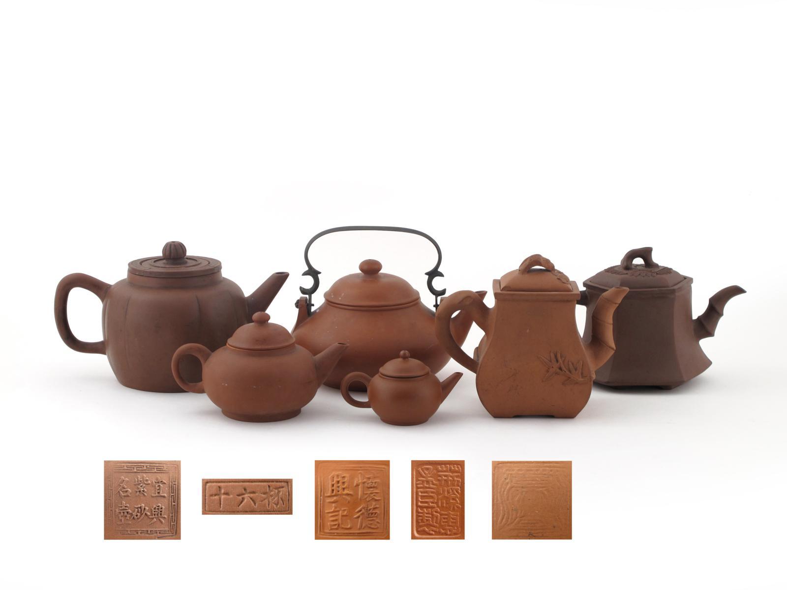 Six Yixing teapots and covers, one with a liner, one miniature, one with an overhead metal handle, and two applied with bamboo, pine and prunus, various marks, 23cm max. (13)