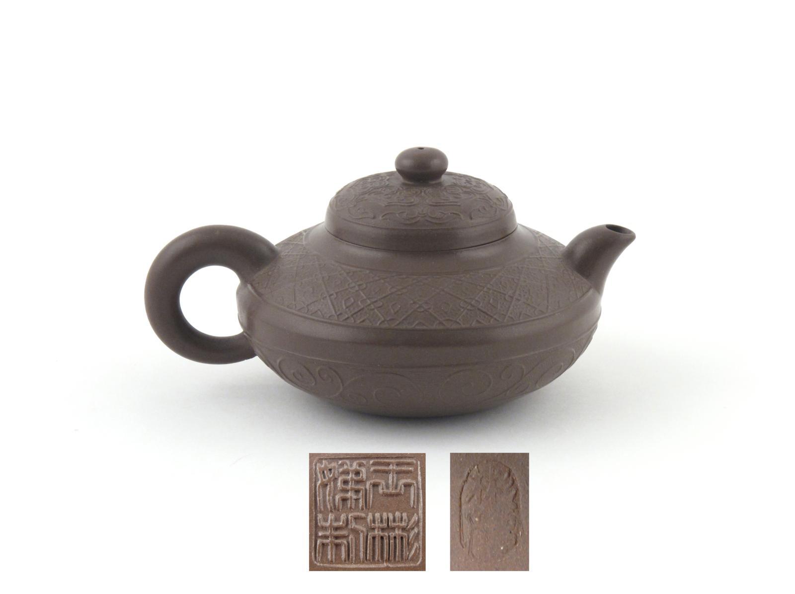 A small Yixing teapot and cover modern, by Yang Qinfeng and Wang Shengdi, moulded after an ancient bronze vessel, impressed seal mark to the base and cover, 15cm. (2)