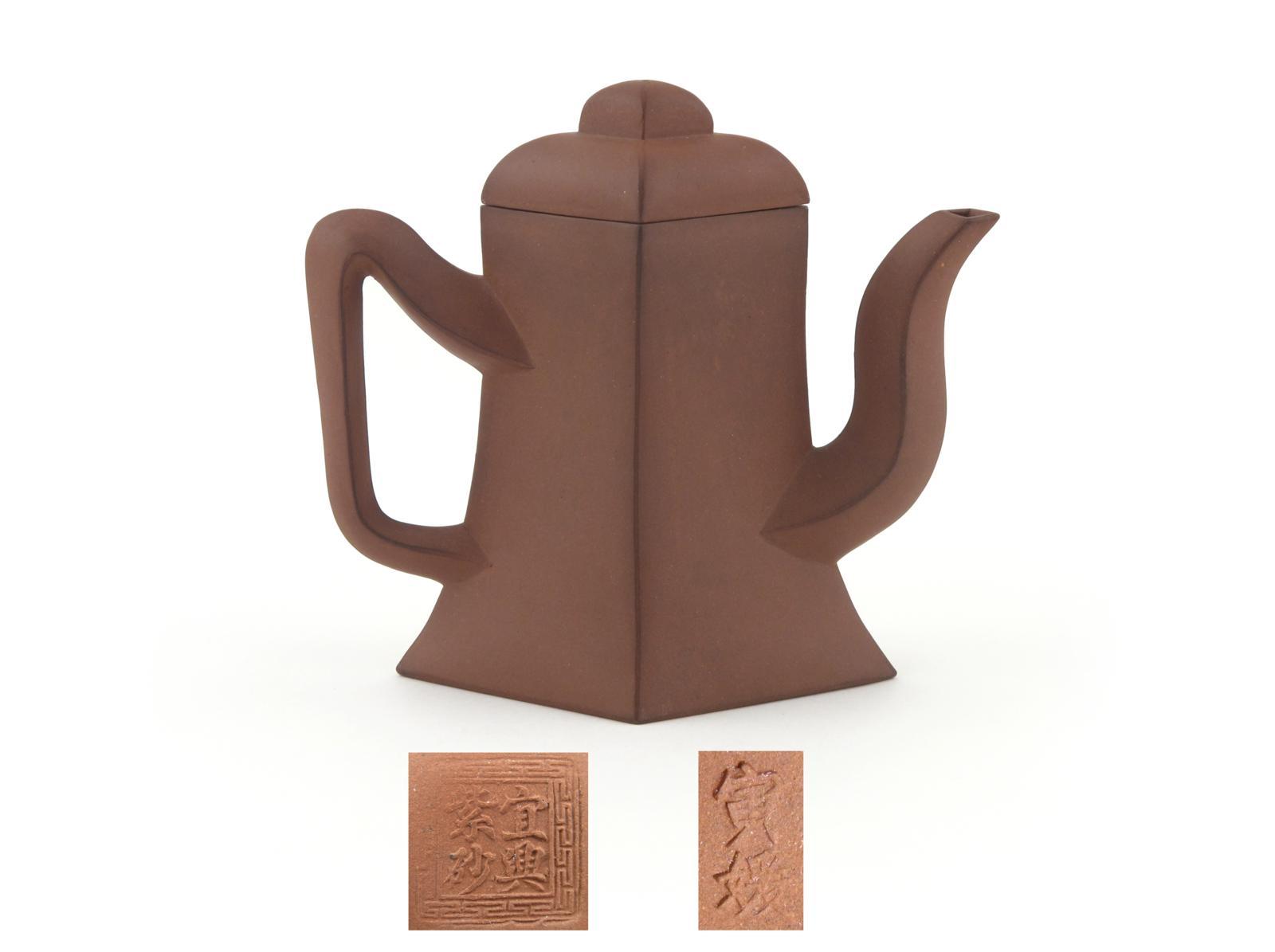 A tall Yixing teapot and cover early 20th century, the rhomboid shape echoed in the spout and handle, impressed Zhi Hua mark to the base, a two character mark to the interior of the cover, 20cm. (2)