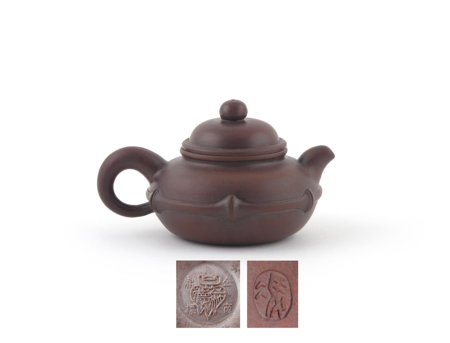 An Yixing teapot and cover 19th century, by Feng Yulin, the flattened globular body encircled with a band of bamboo, impressed marks to the base and cover, 16cm. (2) Provenance: from the collection of Peter and Susan Wain.