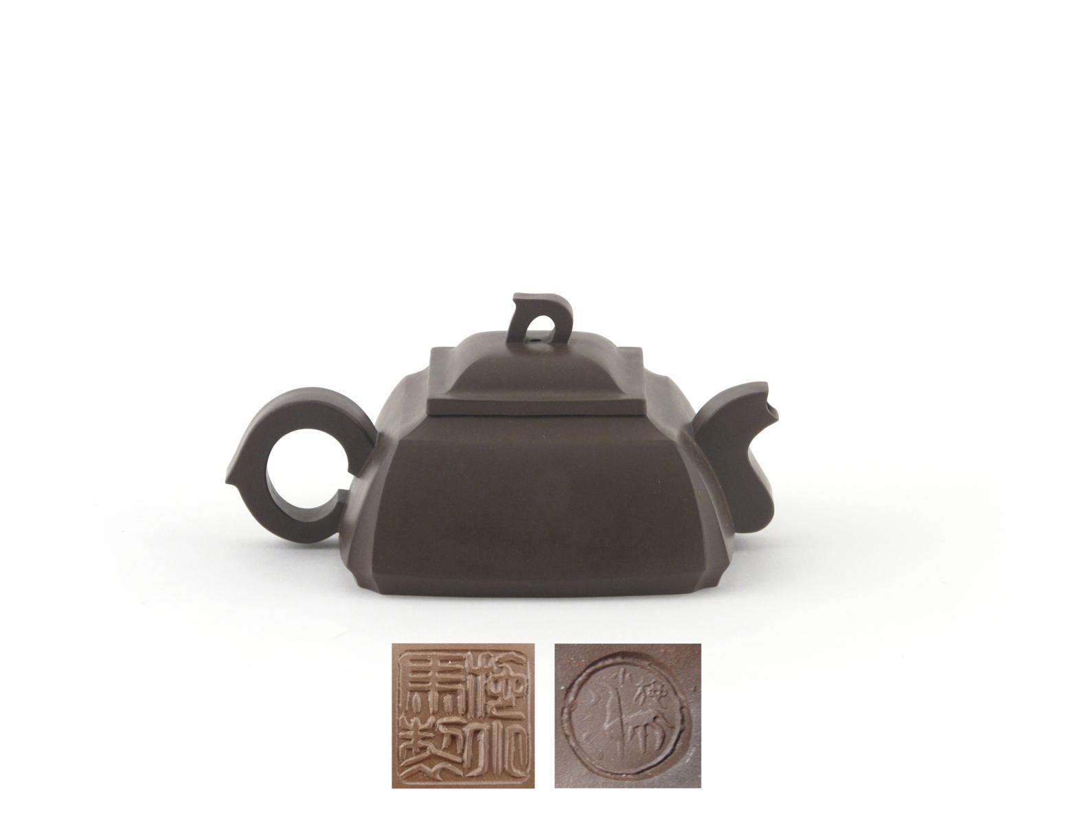 A small Yixing teapot and cover 20th century, by Shi Xiaoma, the body flattened square-section with chamfered corners, impressed four character mark to the base, the cover with a further impressed mark, 14cm. (2)